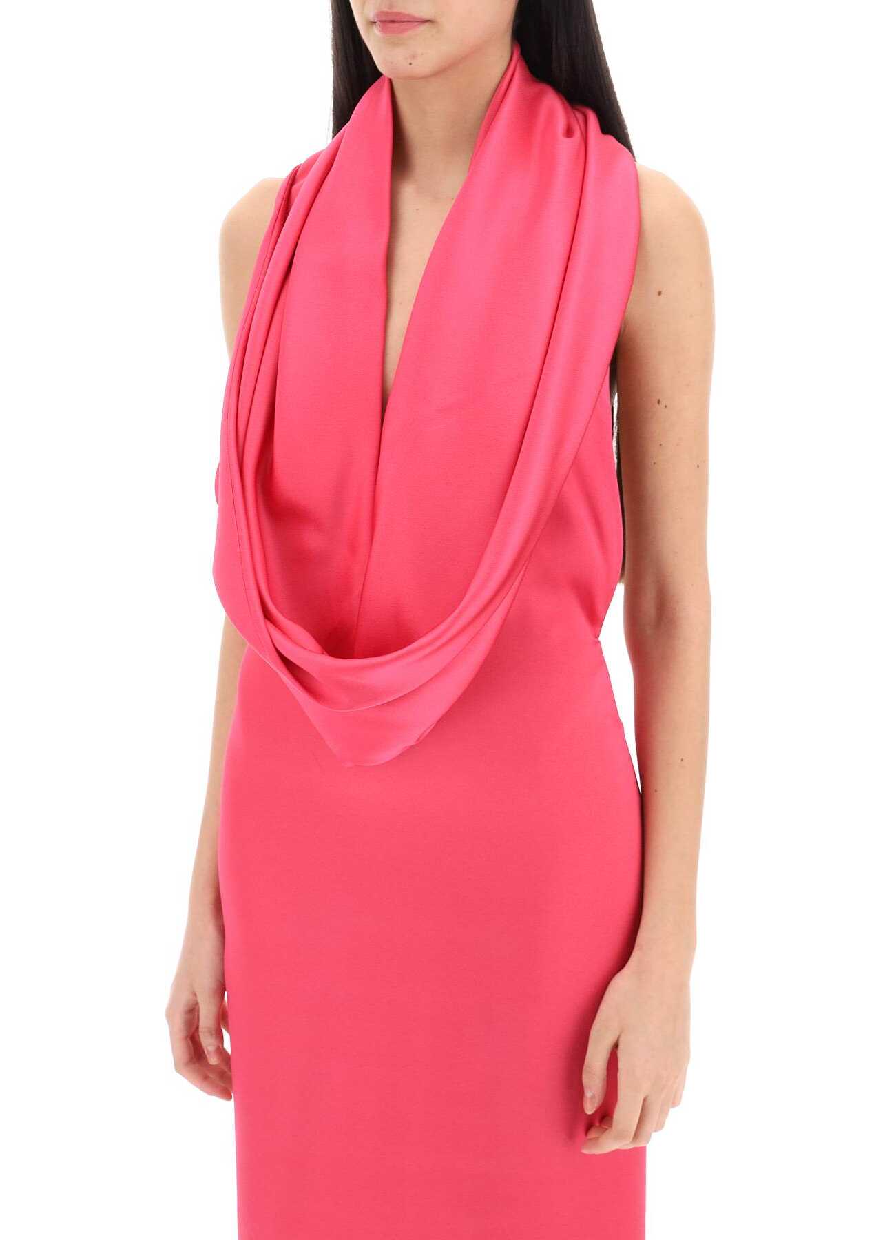 Giuseppe Di Morabito maxi gown crafted in viscose-blend cady satin, with halter neckline characterized by a draped built-in hood wearable also as a scarf. It features open back, invisible zipper closure and center vent hidden by a long train on the back. Fitted with straight silhouette. The model is 177 cm tall and wears size IT 40.