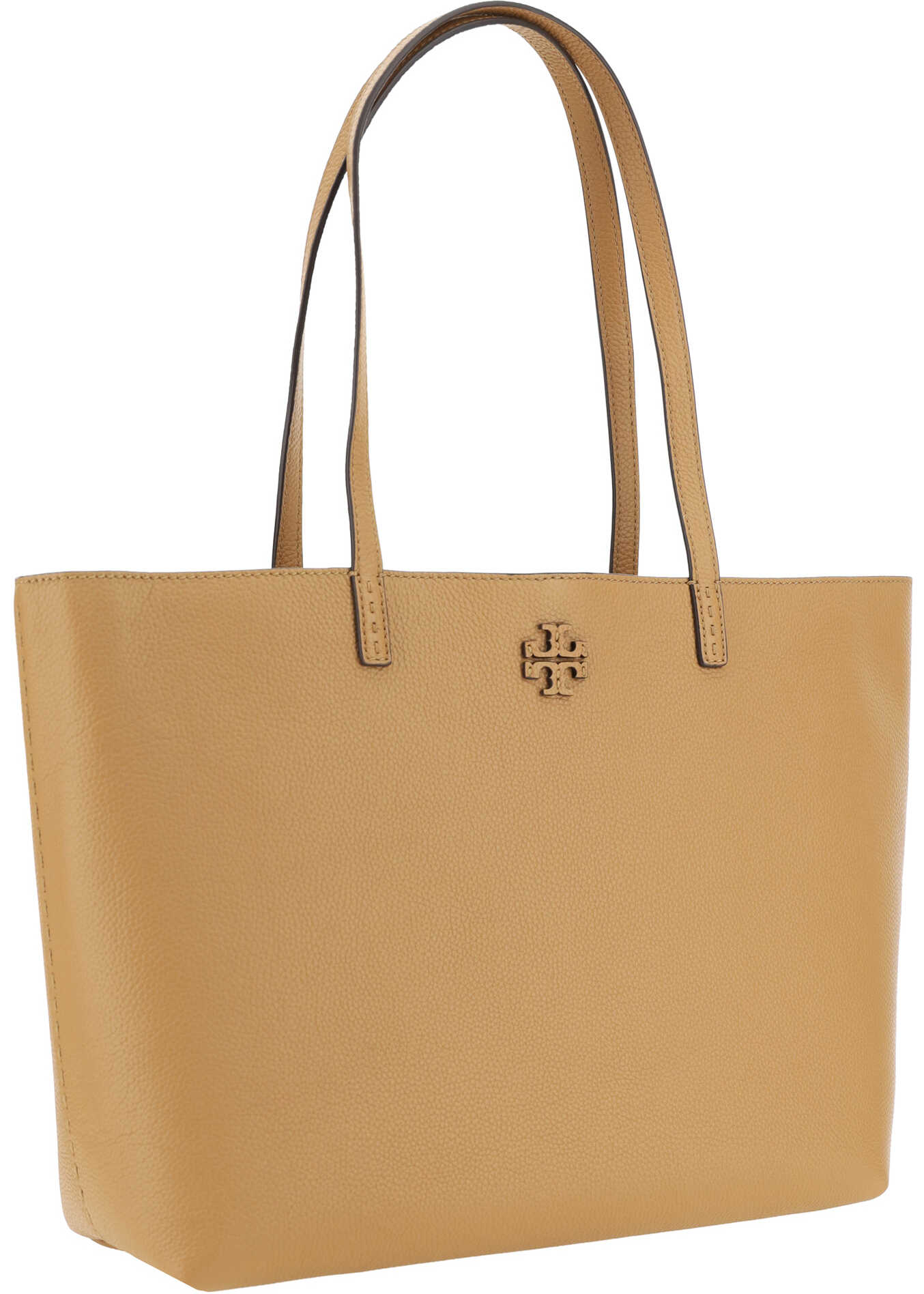 Calfskin Mcgraw Shoulder Bag by Tory Burch, grained leather design, double flat top handles, interior hook-and-eye closure, single interior compartment, iconic brand logo applique on front.
