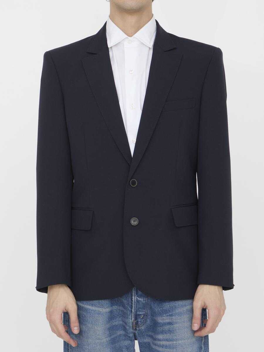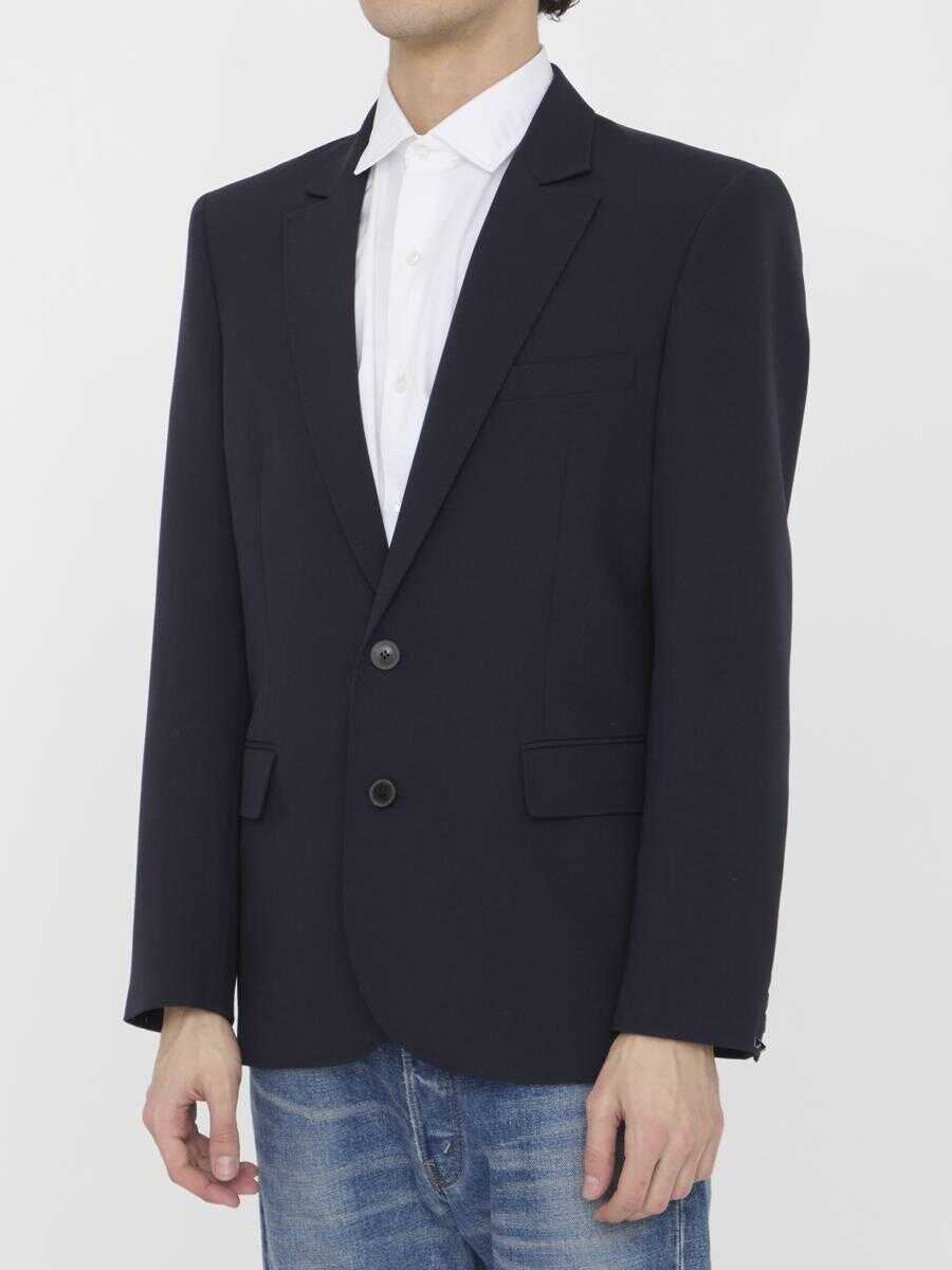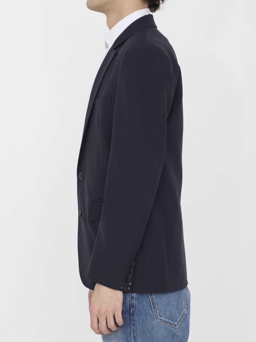 Blue wool blend jacket. It features peaked lapels, single-breasted closure, two front flap pockets, a welt pocket on chest and buttoned cuffs with studs. 29 label sewn inside. Regular fit.