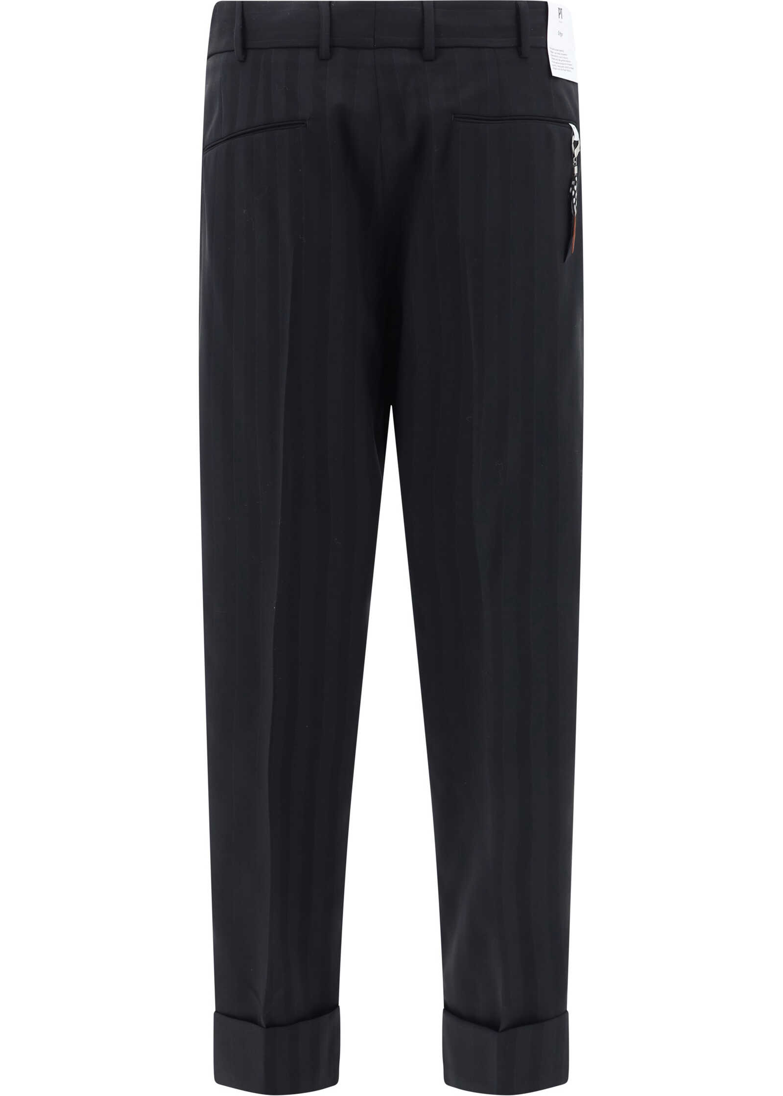 Virgin Wool Pants by PT Torino, front closure with hidden hooks and zipper, two side slash pockets, two welt pockets on back, waistband loops, striped pattern, turned-up hem, removable feather detail applied to back pocket, regular fit.