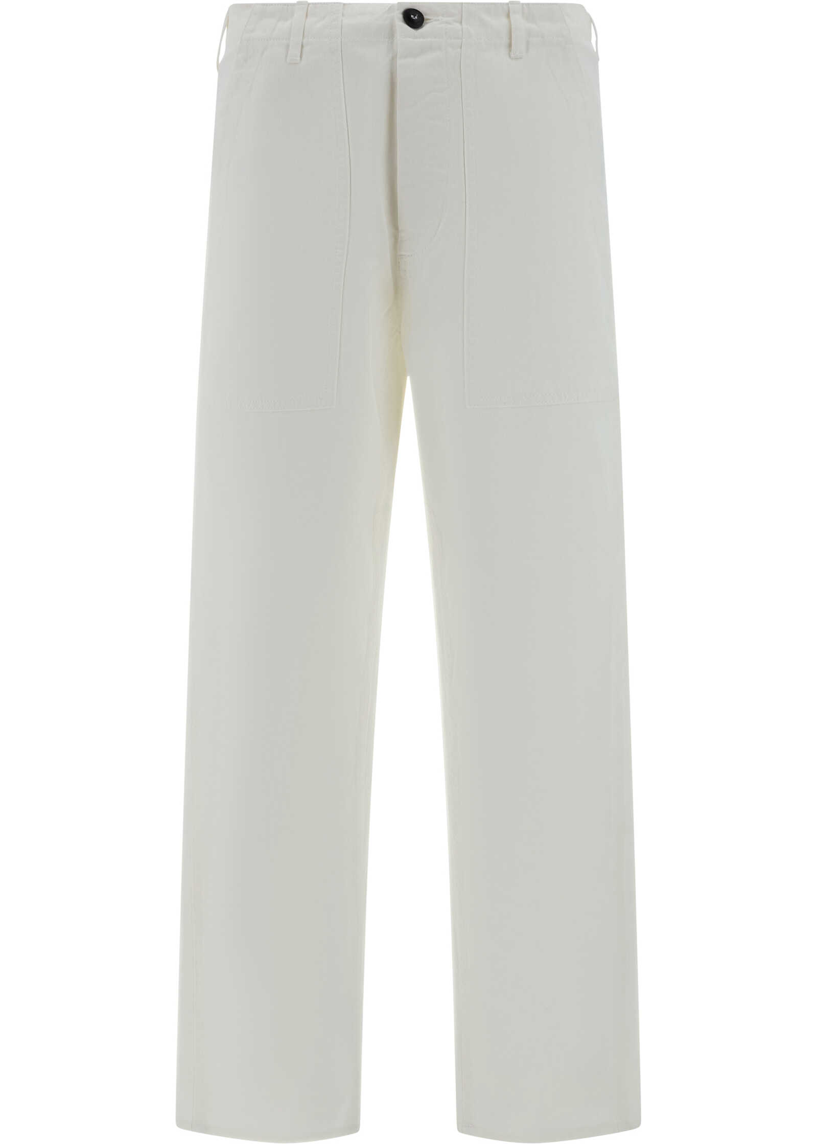 Cotton Fatigue Pants by Fortela, denim design, button and zipper front closure, two slit patch pockets on front, two flap patch pockets on back, waistband loops, monochrome pattern, regular fit.