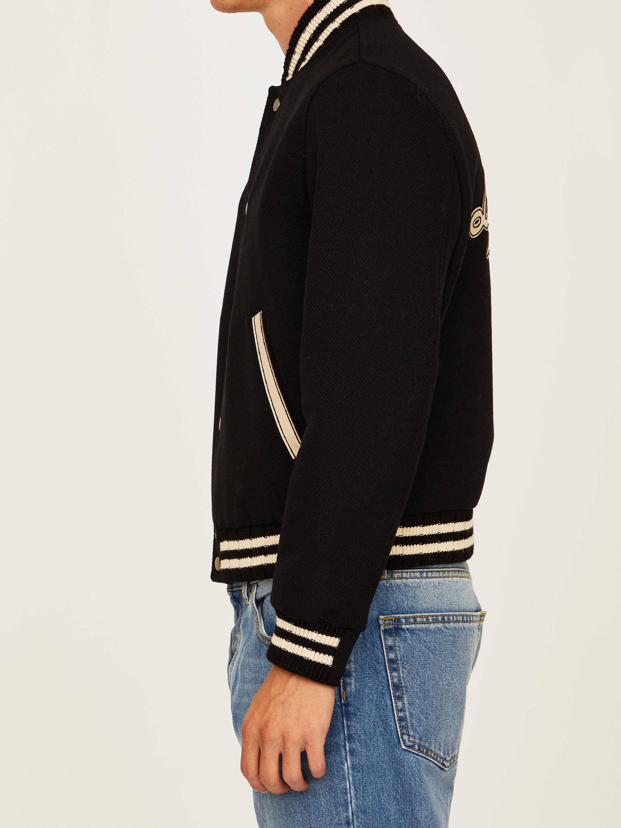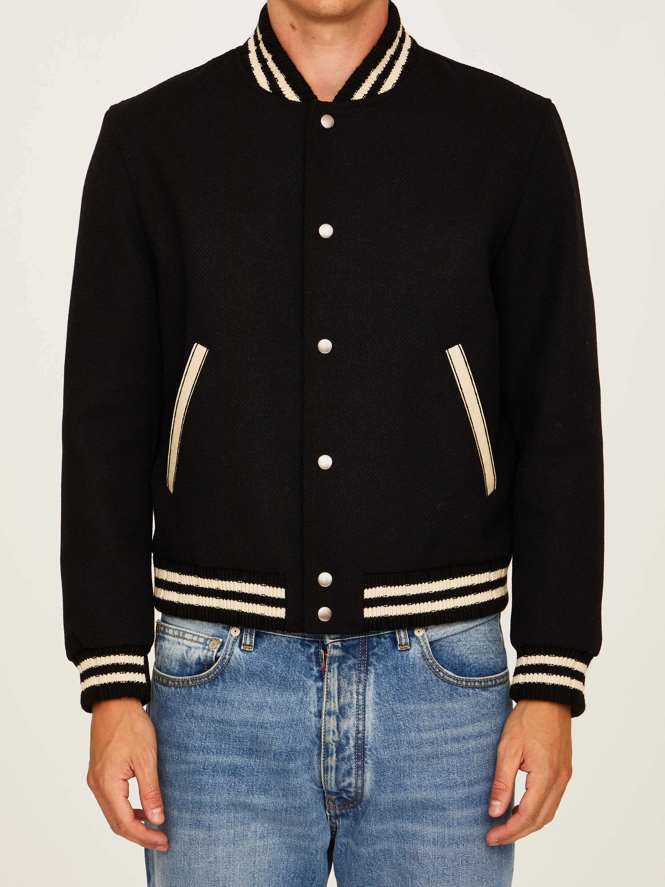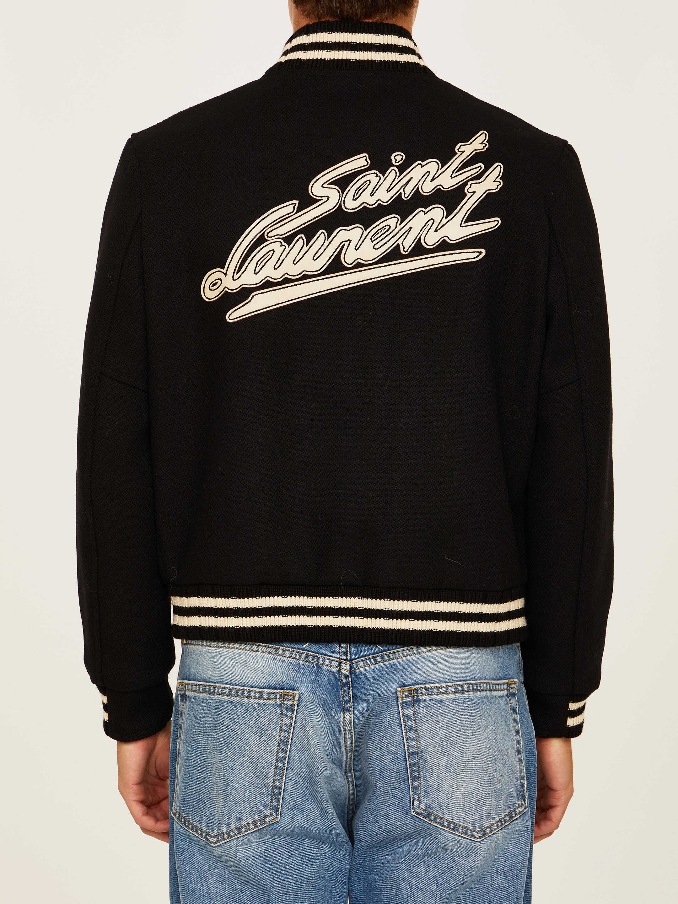 Teddy bomber jacket in black wool with white details and Saint Laurent signature embroidered at the back. It features snap button closure, two side welt pockets and ribbed knit neck, cuffs and hem. Regular fit.