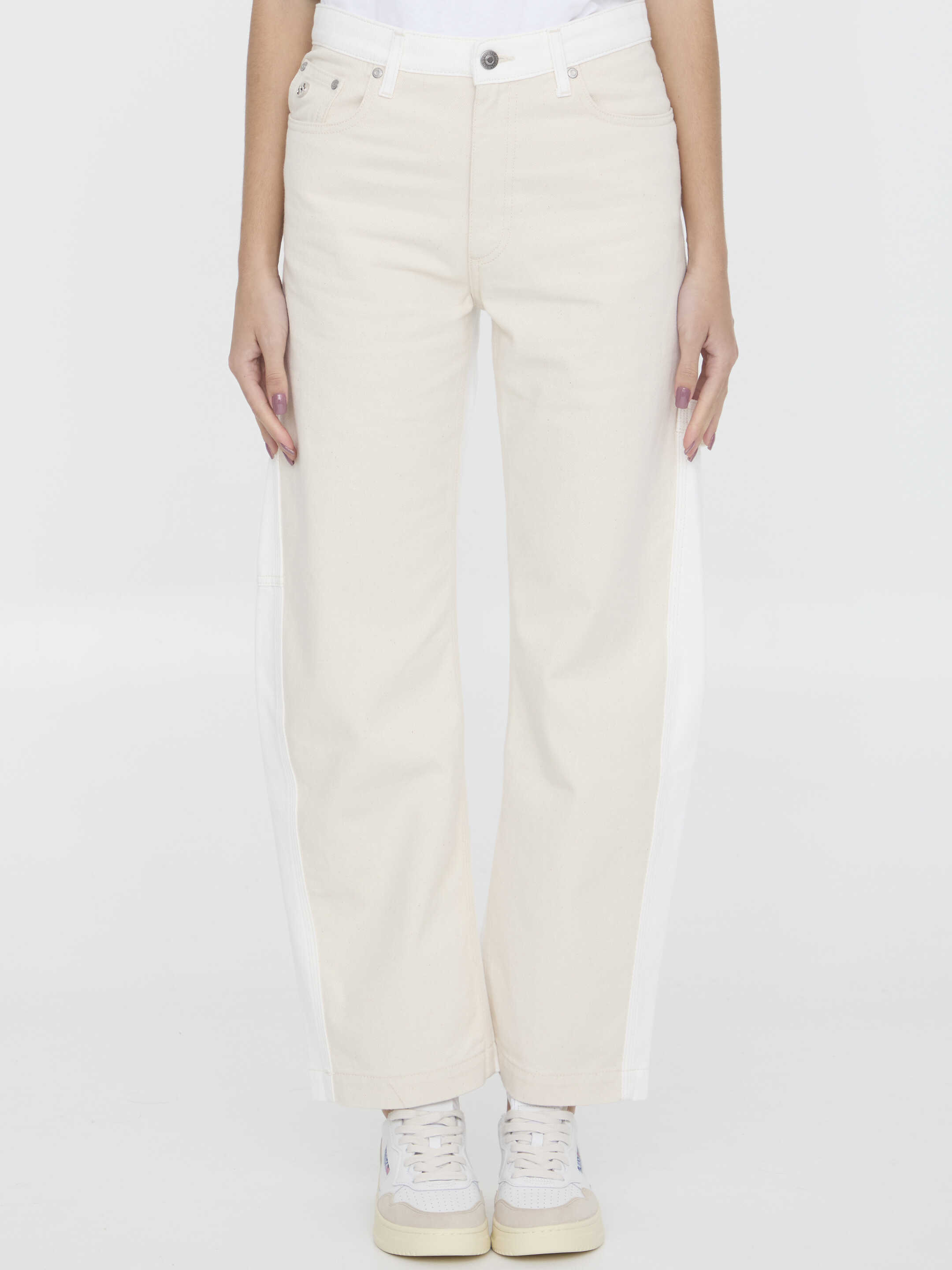 Banana leg Utility jeans in ecru organic cotton denim with pure white back. It features zip and button closure, five-pocket design, belt loops and S-Wave detail at hip. Stella McCartney logo label at the back. Regular fit.