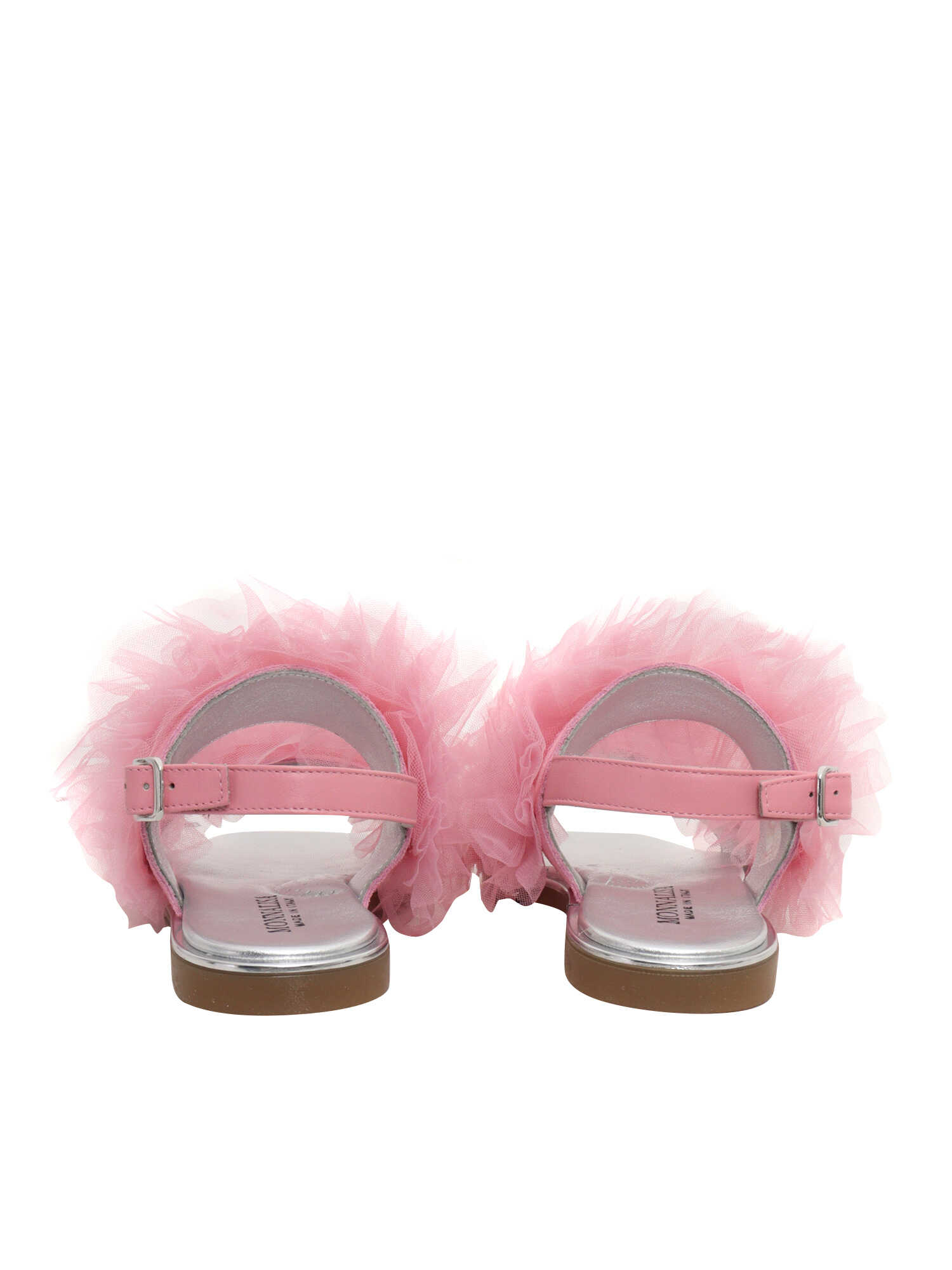 Girl's sandals in pink leather with tulle rouges applied on the upper, contrasting sole, adjustable strap behind the ankle, heart-shaped pendant.