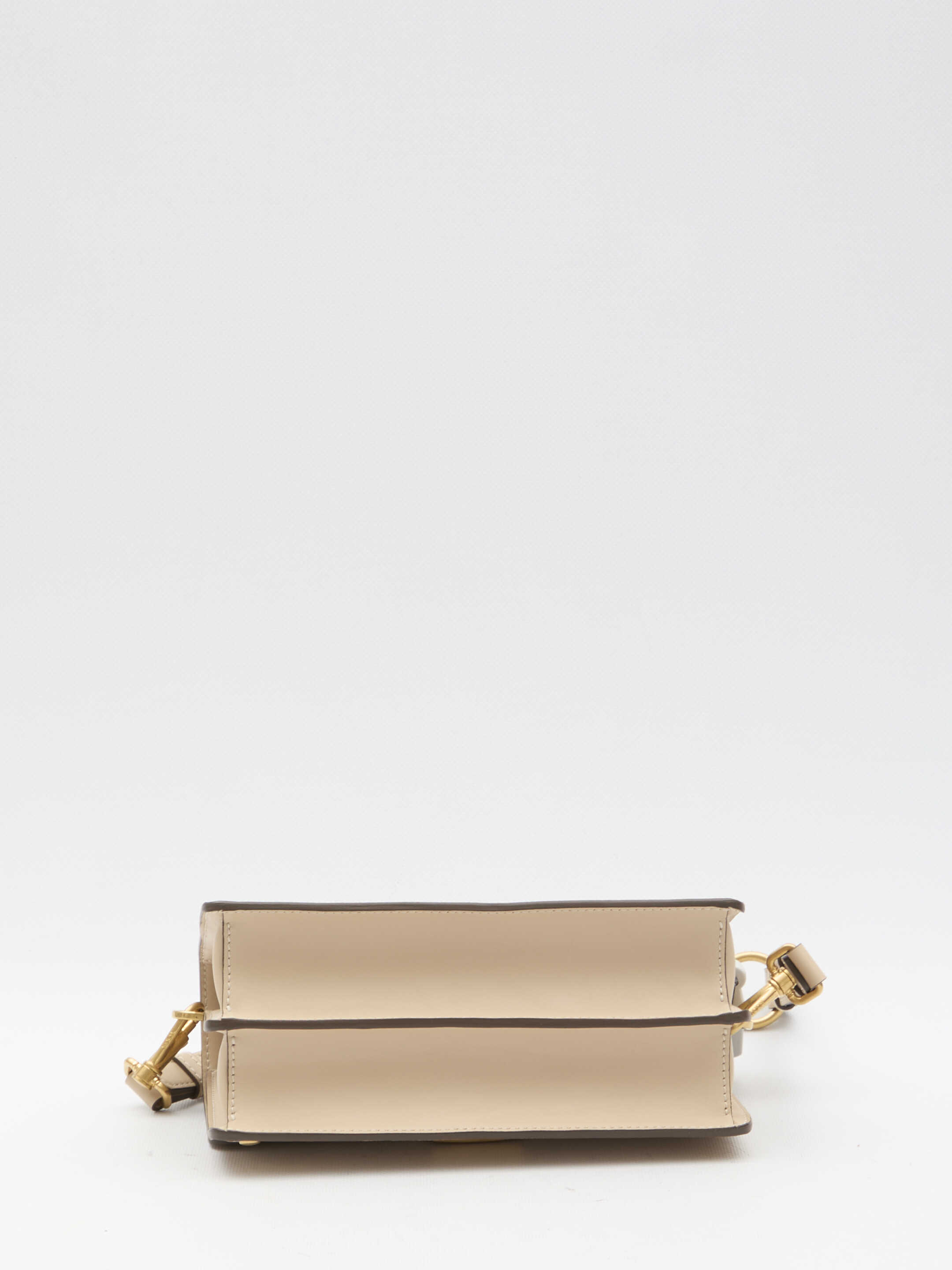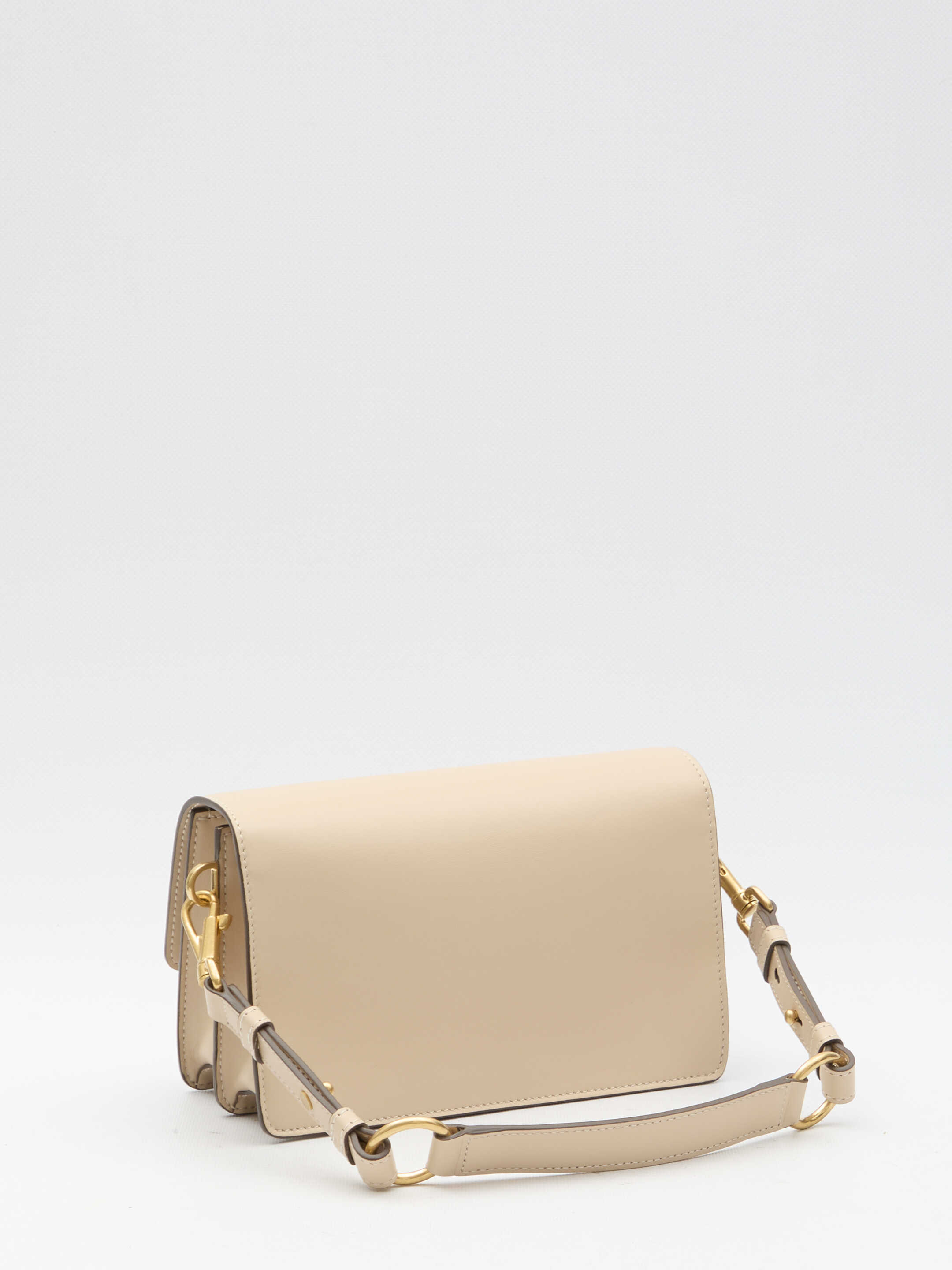 Nude leather bag with gold-tone metal T Timeless detail. It features detachable top handle, adjustable and detachable shoulder strap, magnetic closure, two main interior compartments and one interior slip pocket.