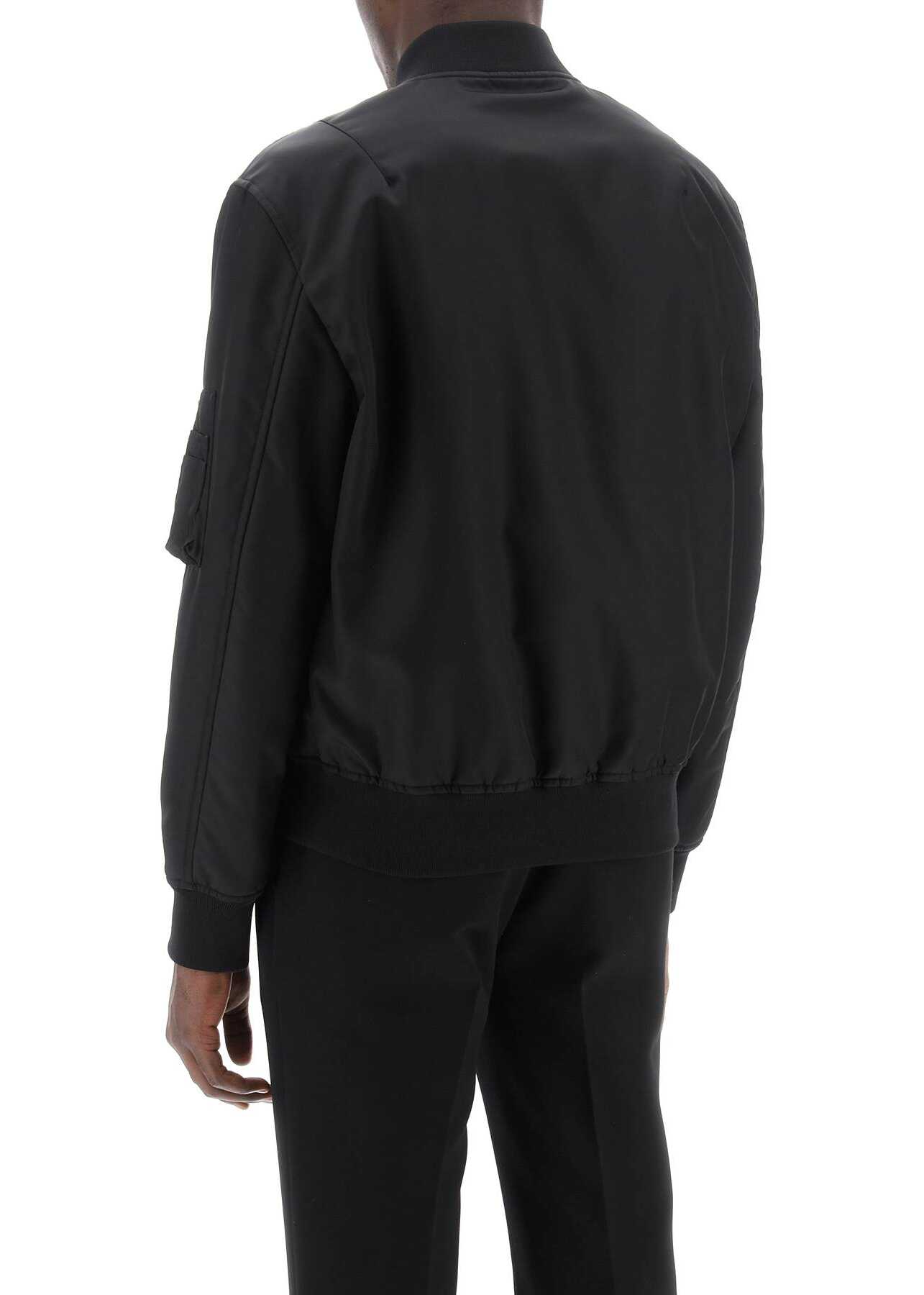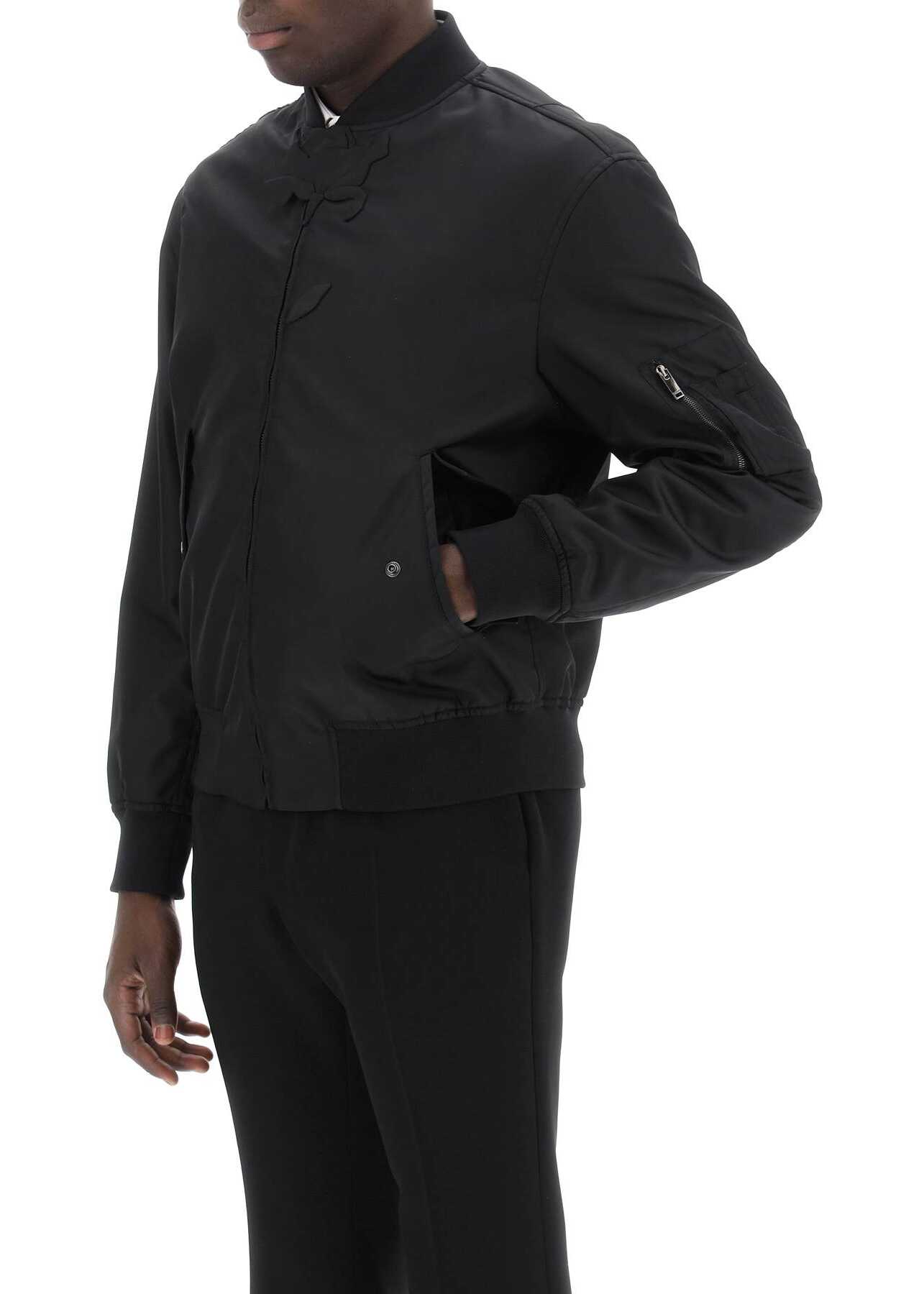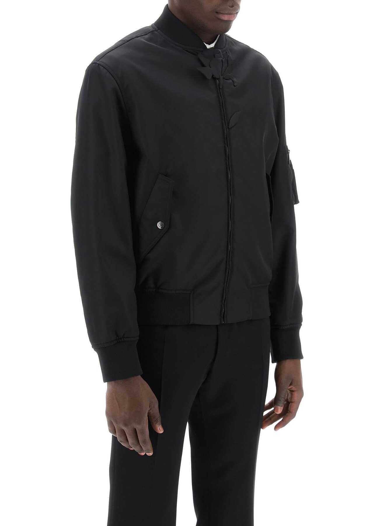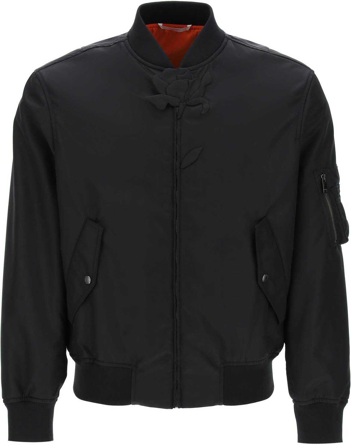 The classic design of this Valentino bomber is enhanced by the embroidered floral detail on the closure. Made of nylon with ribbed finishes, the garment features a zip closure, side pockets with flaps, and a pocket on the sleeve. The contrast lining interior has an additional pocket. Light polyester padding. Regular fit. The model is 187 cm tall and wears size IT 48.