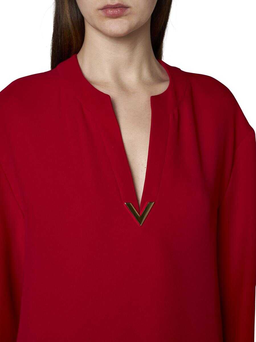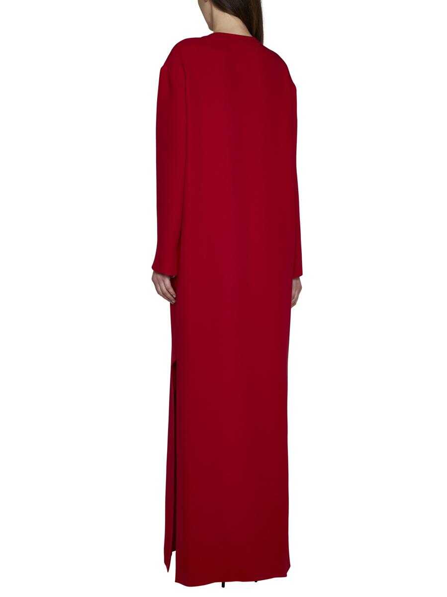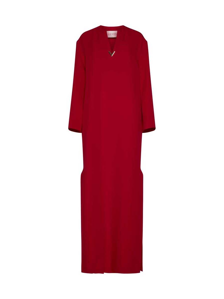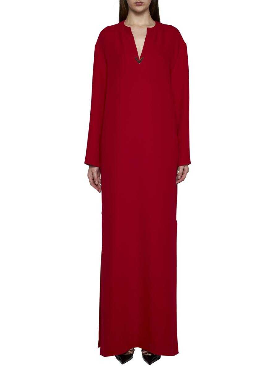 Valentino’s red silk long dress featuring a round and V-neck with gold-tone metal VLogo plaque, long sleeves and side slits. Model wears shoes and accessories from Valentino Garavani.