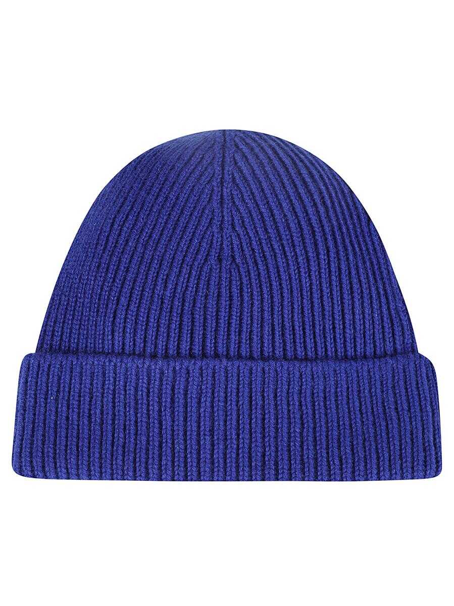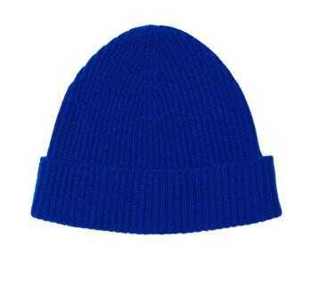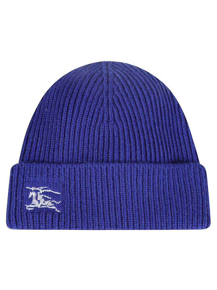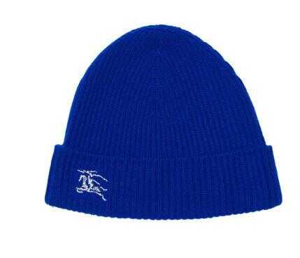 Equestrian Knight cashmere beanie from BURBERRY featuring royal blue, cashmere, ribbed knit, oval crown, signature Equestrian Knight motif, embroidered logo to the front and turn-up hem.