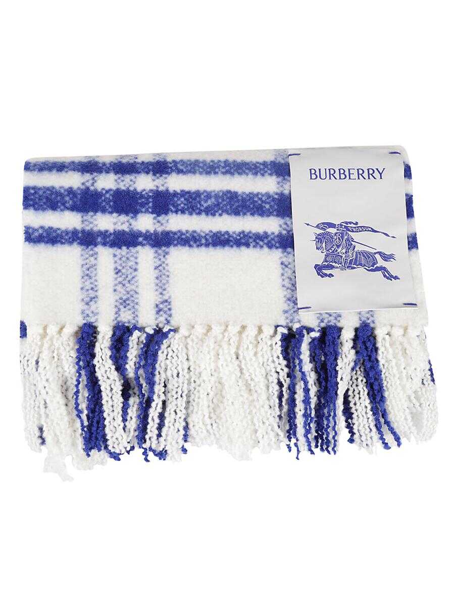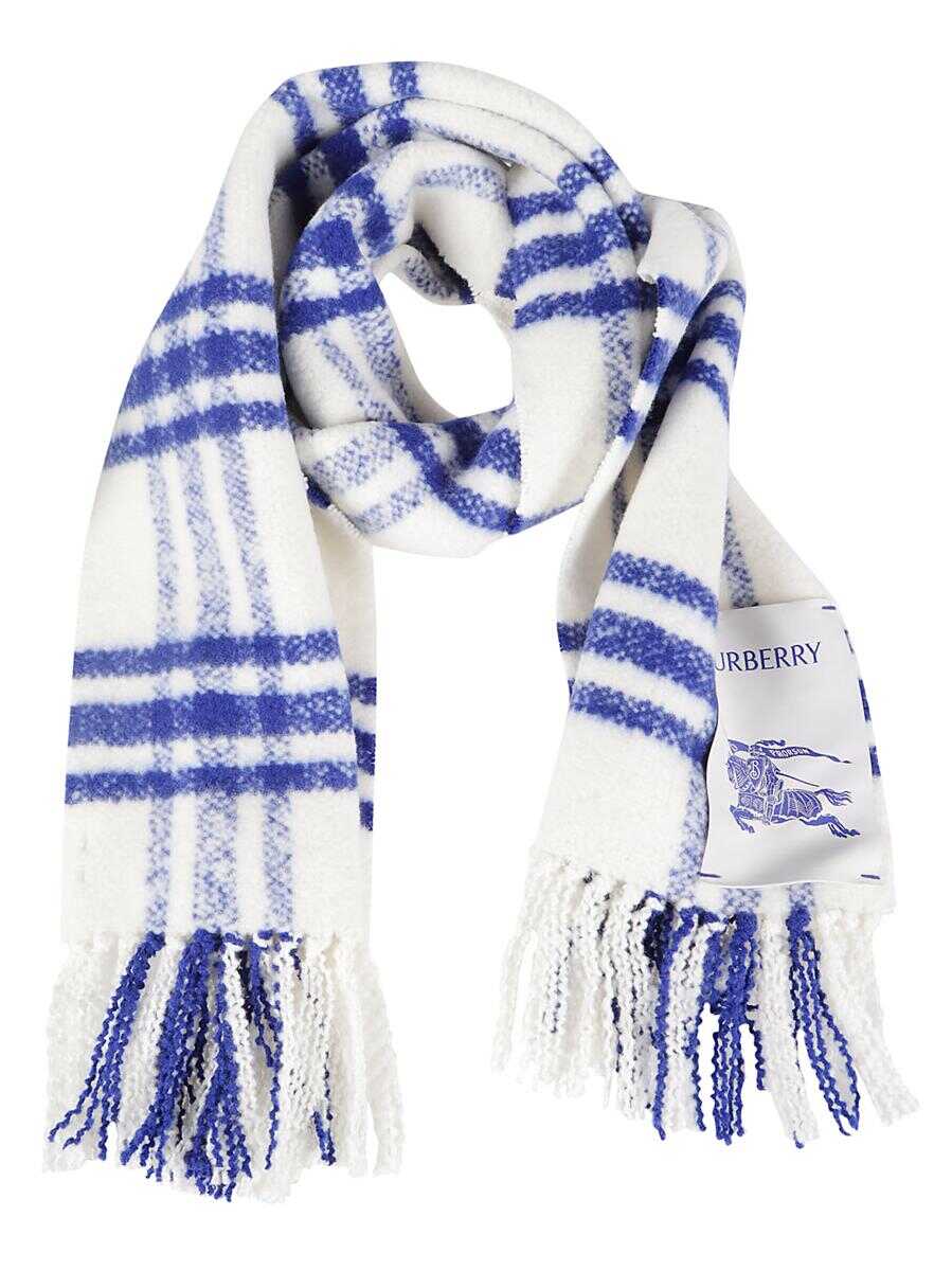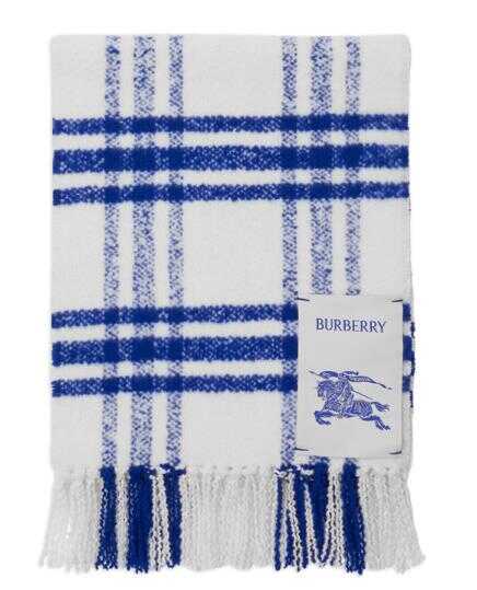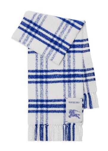 logo-patch checked wool scarf from BURBERRY featuring white, navy blue, wool, logo patch to the front, signature Equestrian Knight motif, check pattern, fringe detailing and wraparound style.