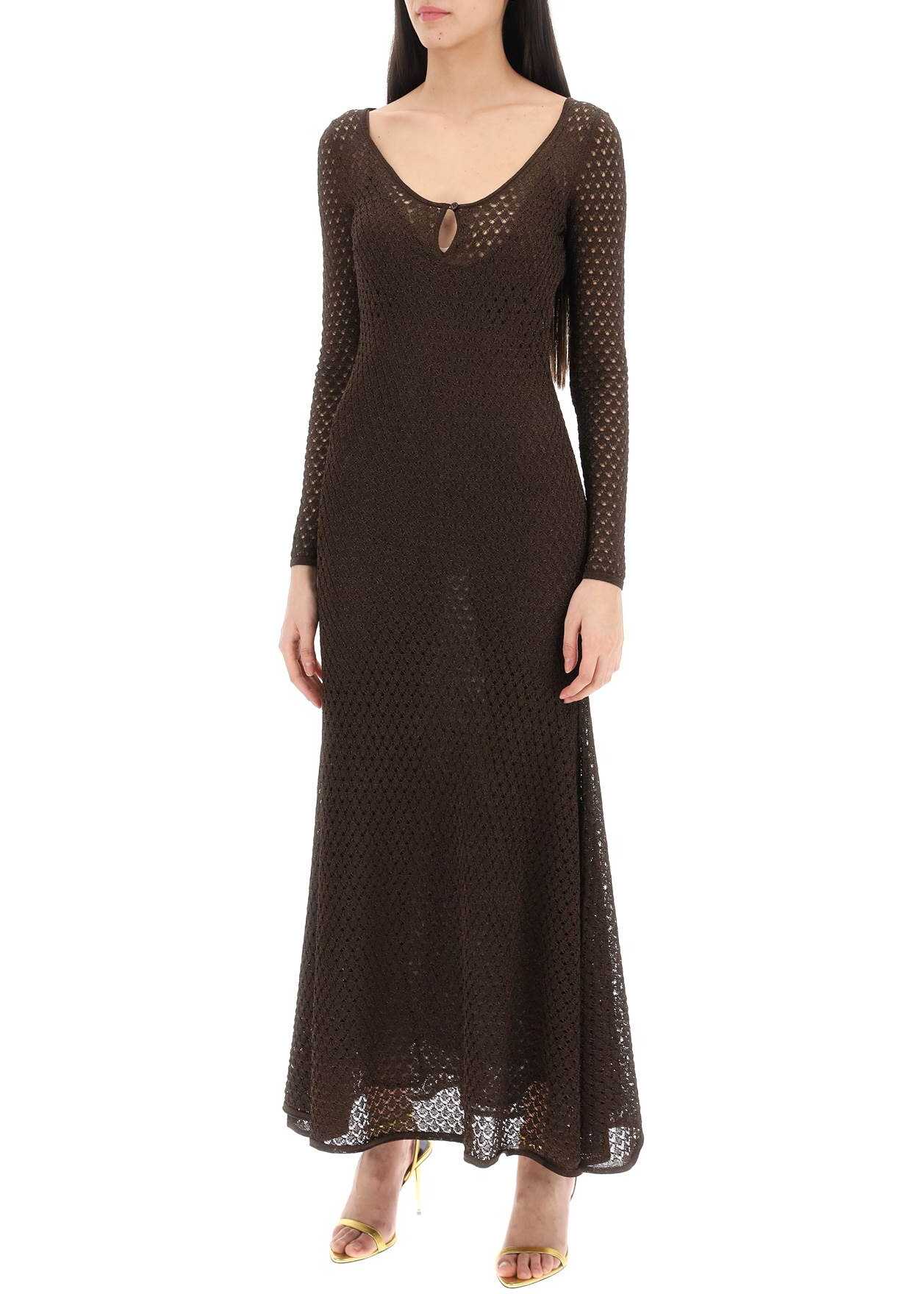 This long Tom Ford dress is made of perforated lurex knit, with a fitted and flared silhouette and long sleeves. The wide round neckline is embellished with a drop detail and button. The dress comes with a removable tonal slip. The model is 177 cm tall and wears size S.