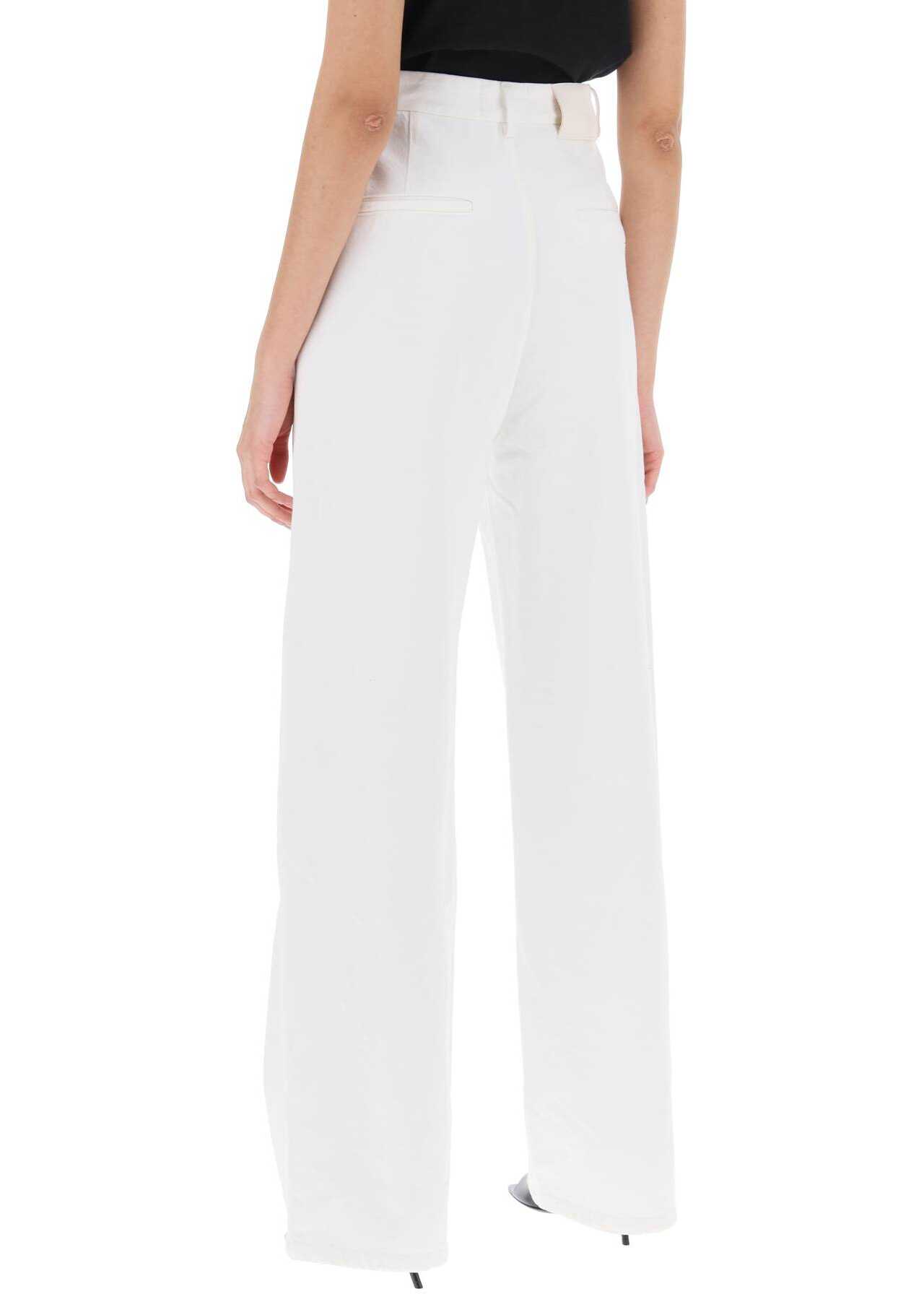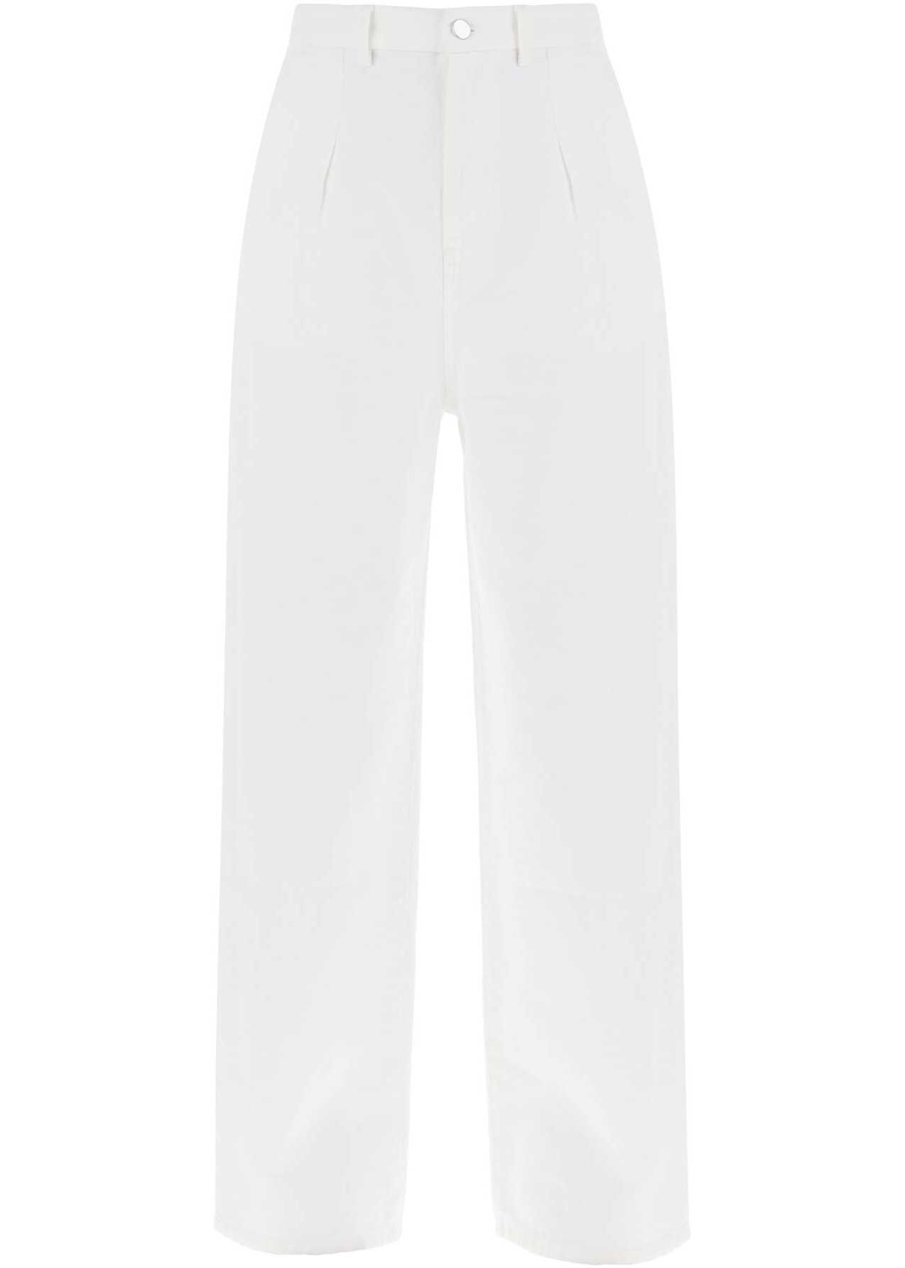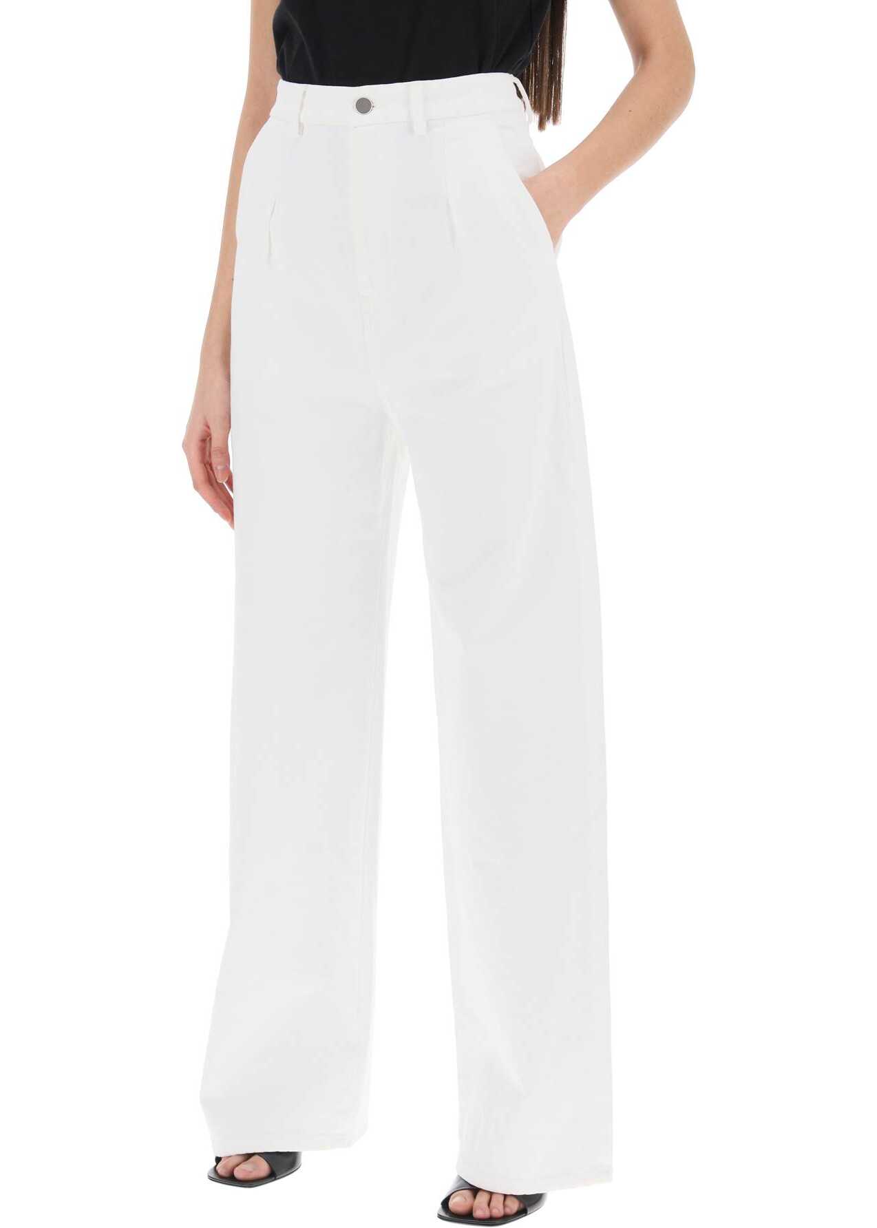 Loulou Studio wide-leg jeans in light wash organic cotton denim, featuring a straight cut with low crotch and front pleats. Zip fly with button fastening, belt loops, side slash pockets and back welt pockets. The model is 177 cm tall and wears a size 27.