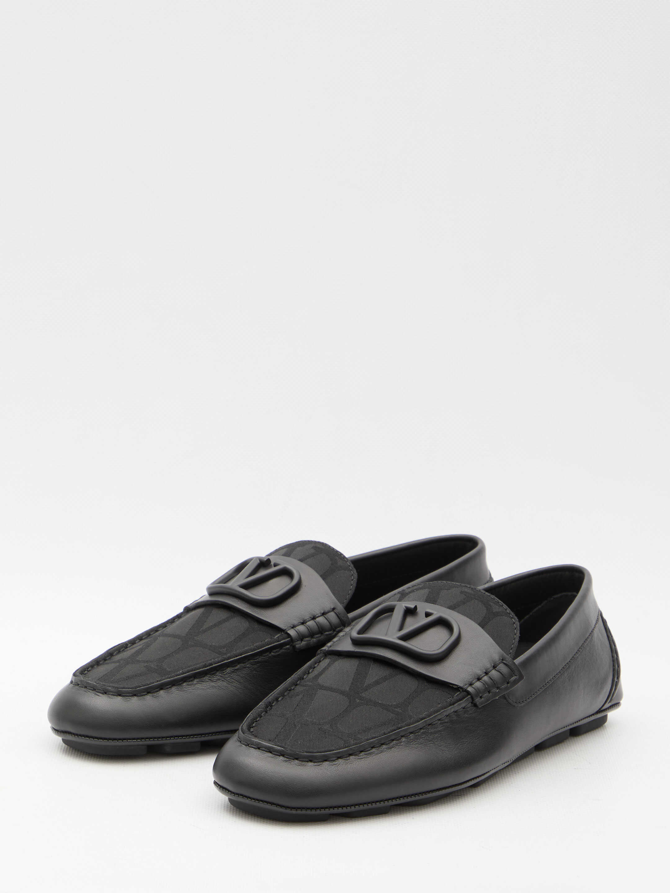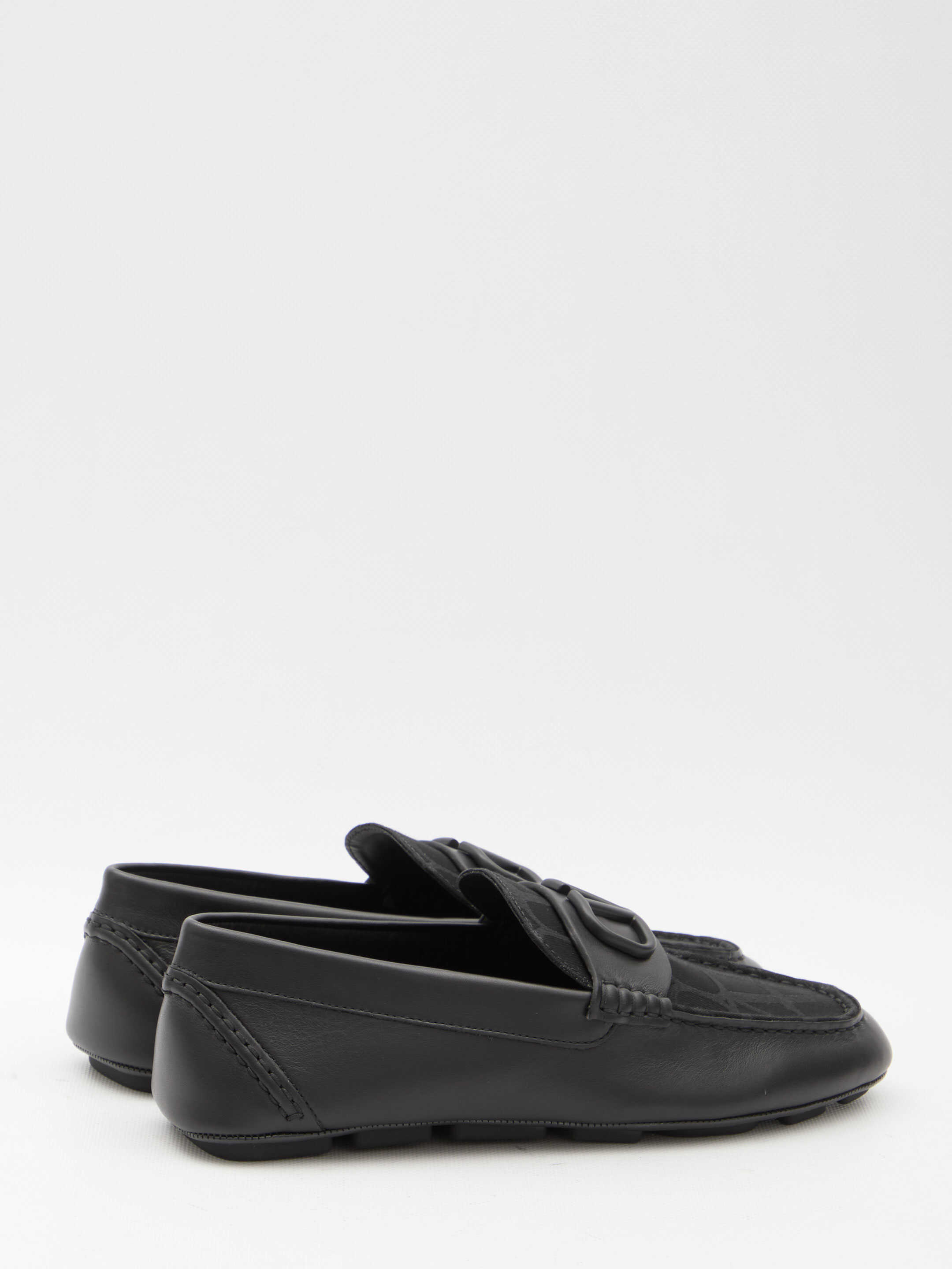 Driver loafers in black leather with Toile Iconographe fabric insert on the upper and VLogo Signature detail. Rubber sole with VLogo Signature detail.