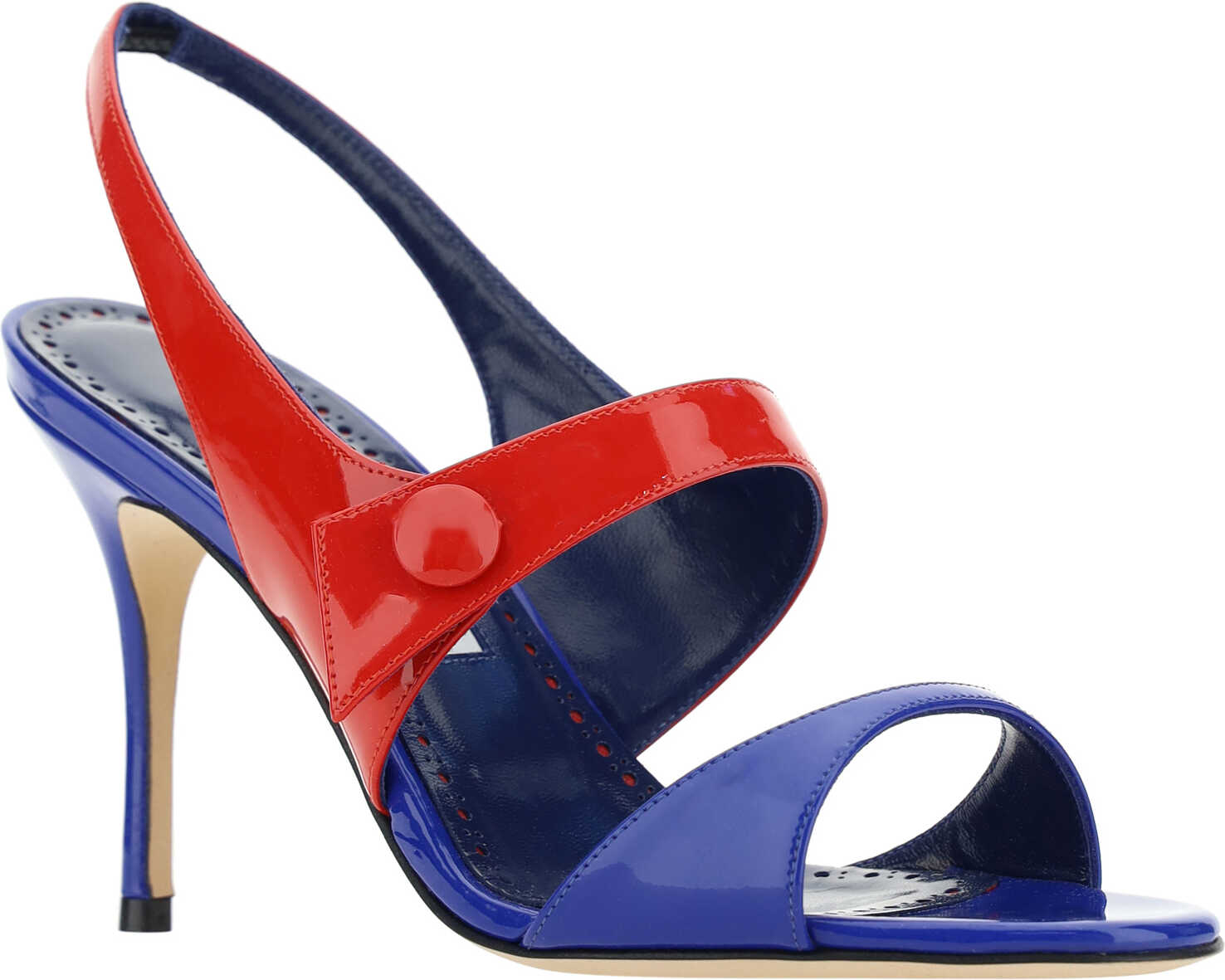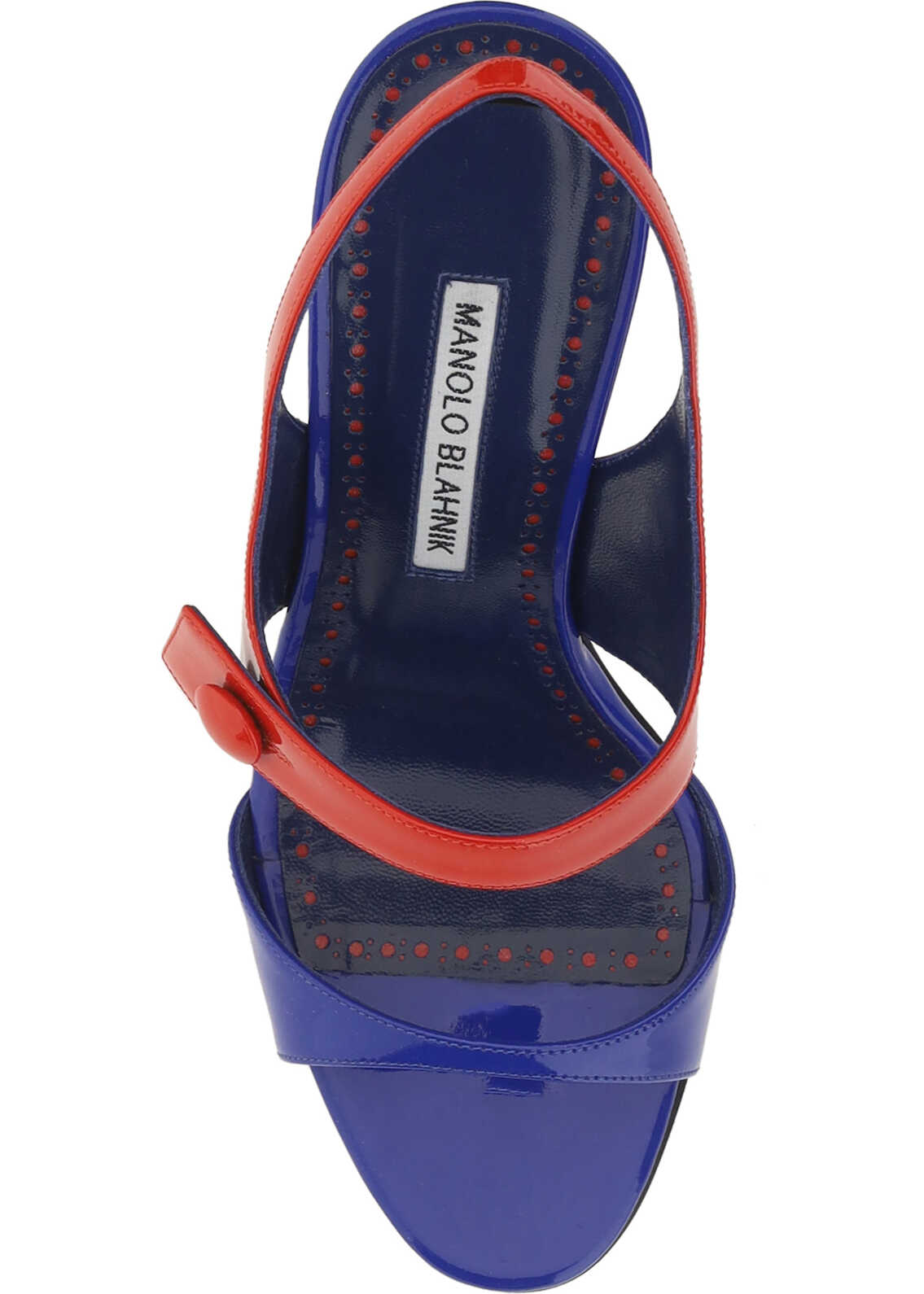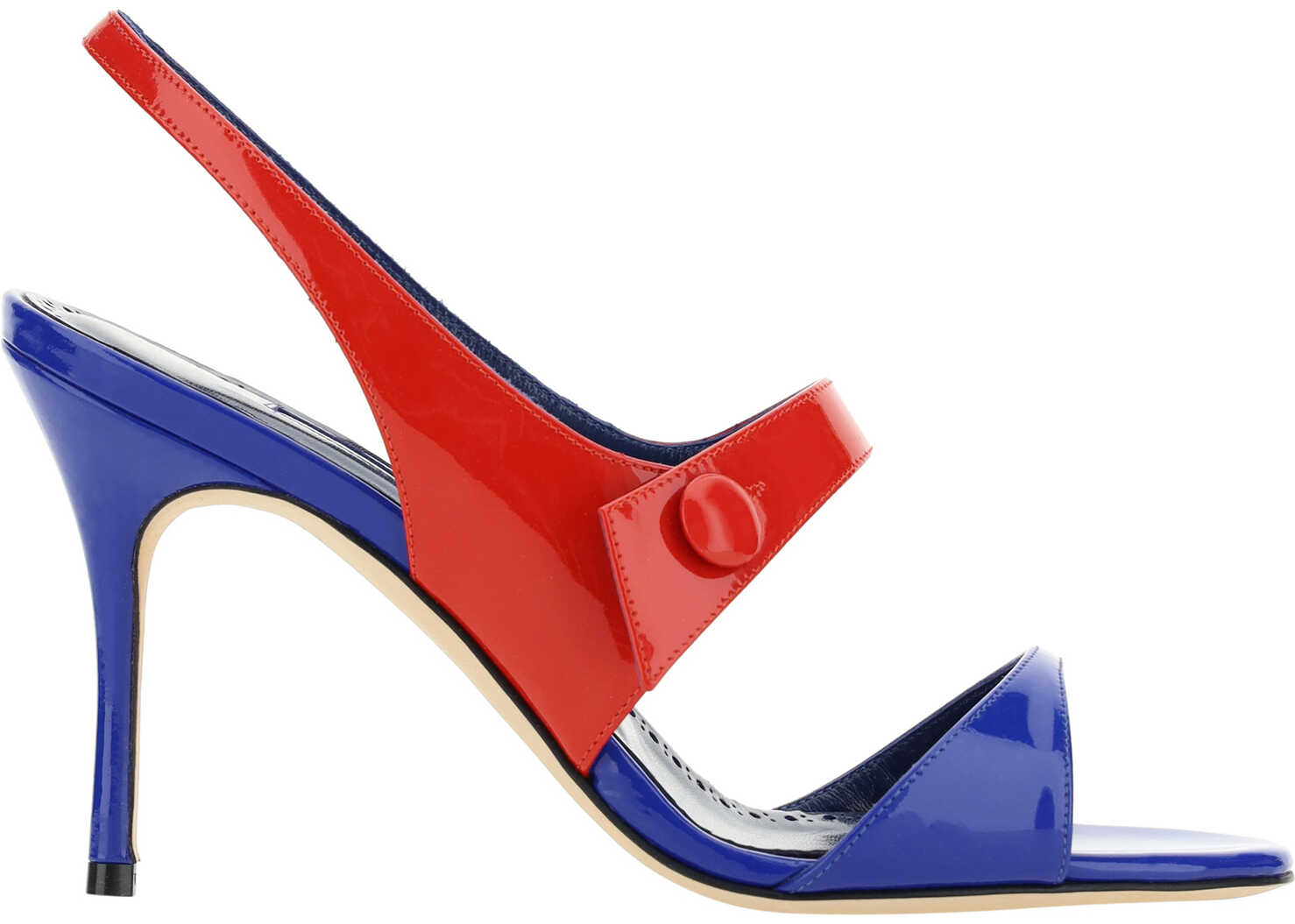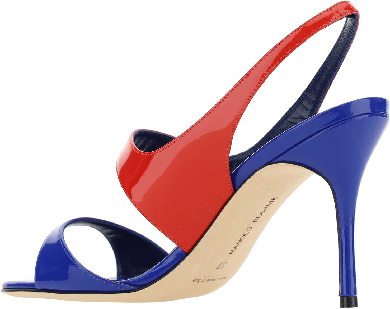 Calfskin Climnetra Fabio Sandals by Manolo Blahnik featuring a patent leather design, an open front toe, a leather stiletto heel, a leather slingbck at the heel, an applique strap at the back of the foot, a two-tone design, and a contrasting logo insole.