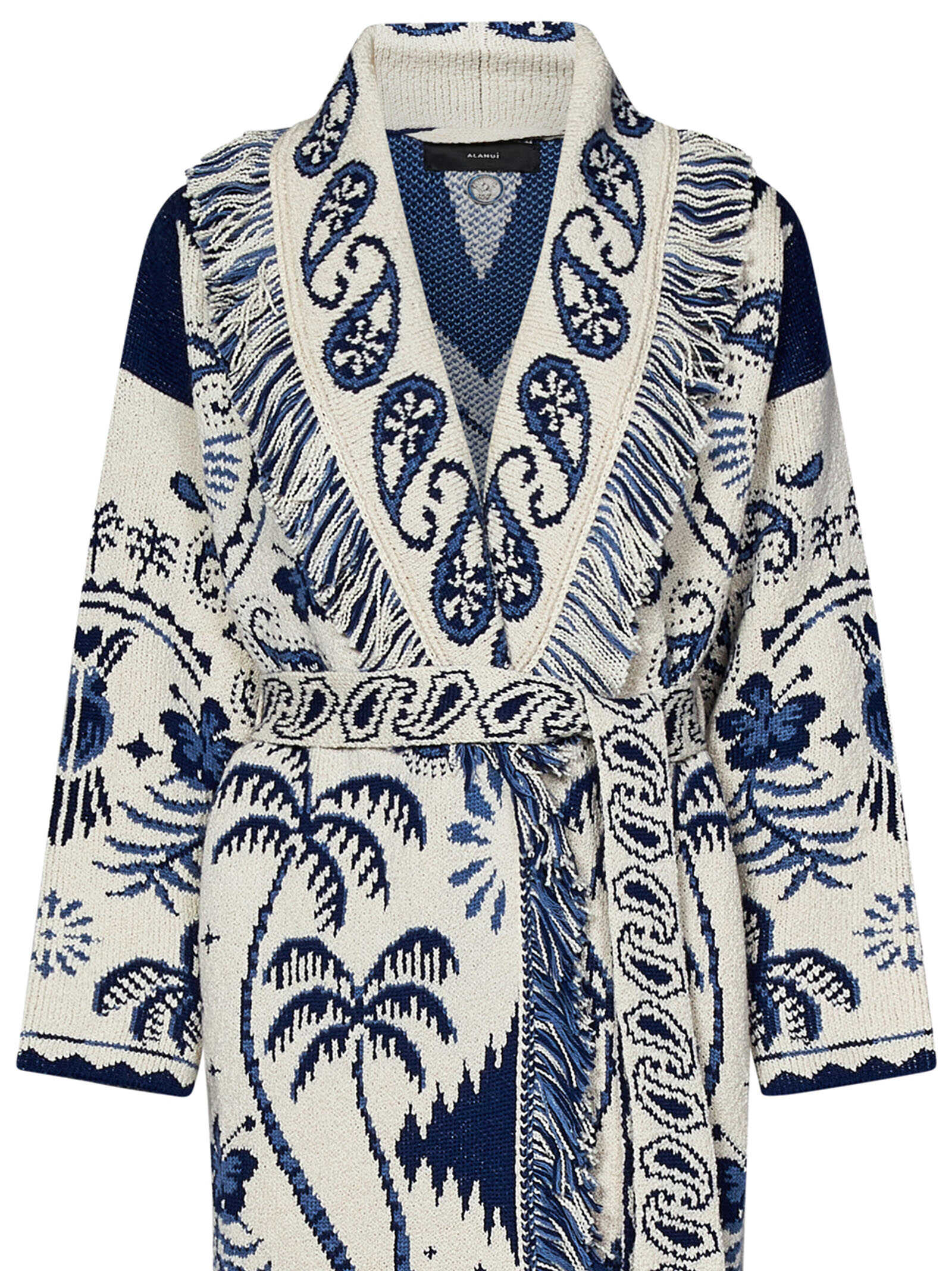 Long chalk and deep blue foulard-motif cotton and wool jacquard knit coat with belt.