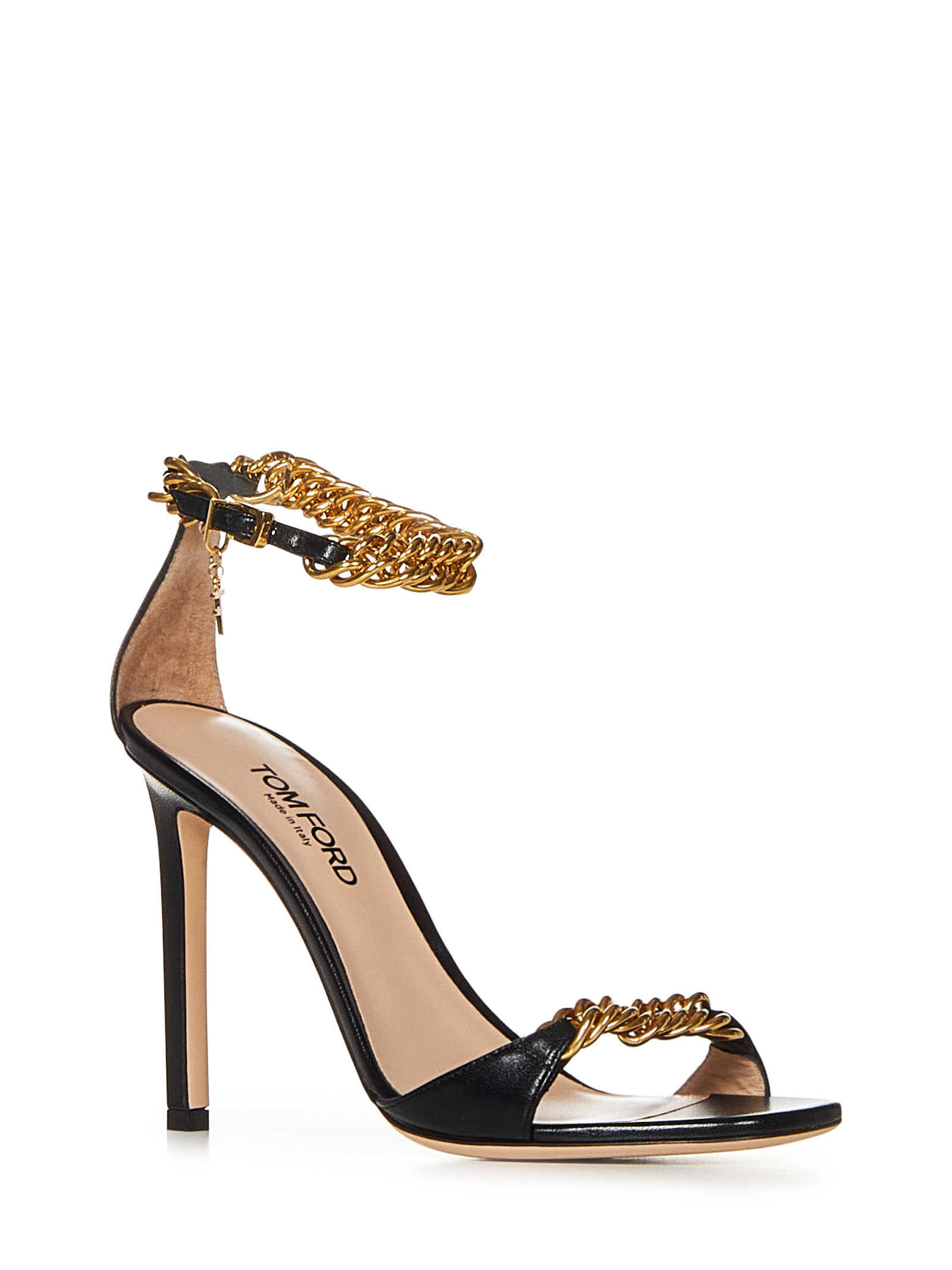 Black shiny leather sandals with gourmette chain detail at front and strap.