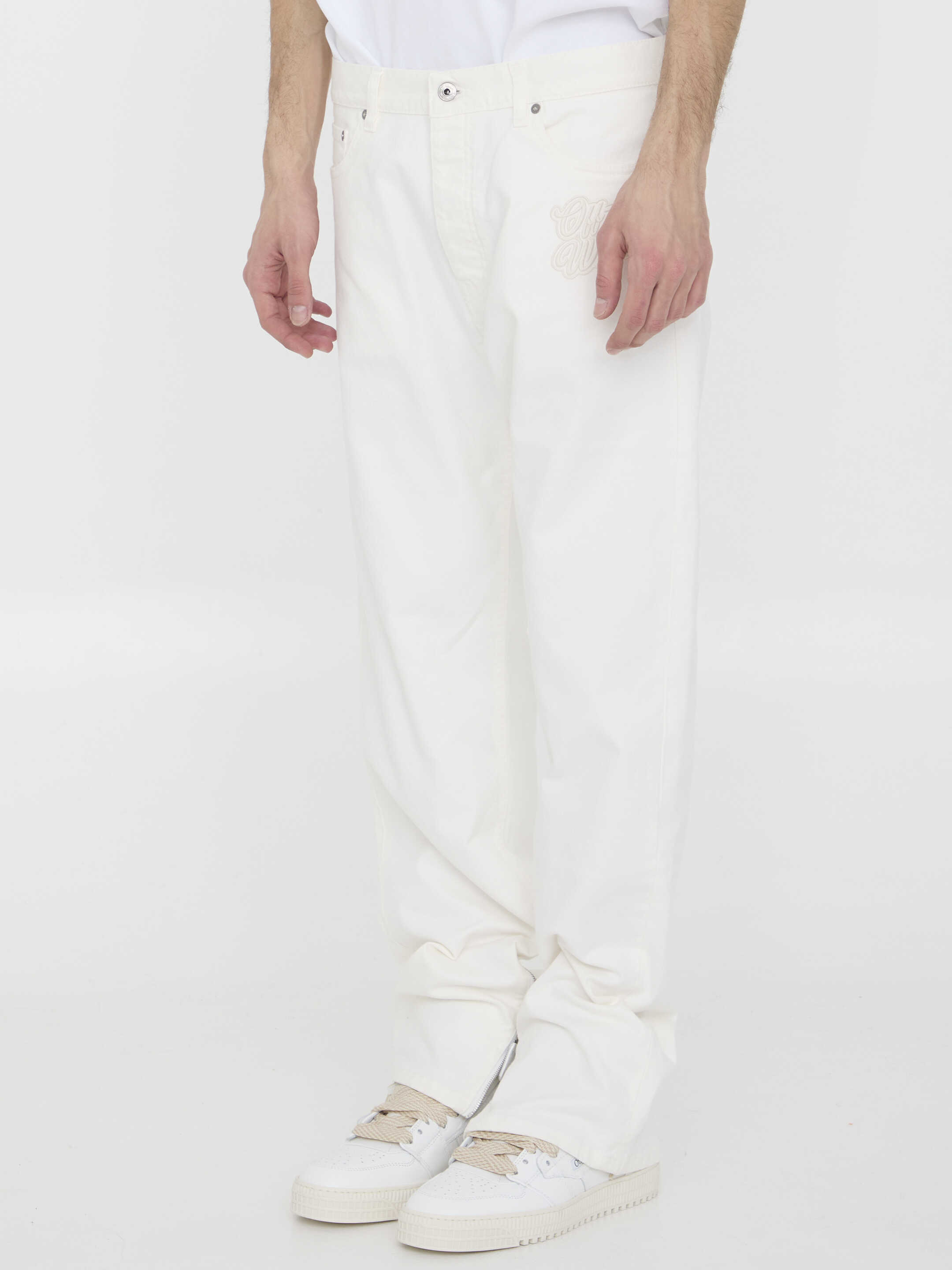 Raw white cotton denim jeans with Off-White logo embroidered on left leg. It features button closure, five-pocket design, belt loops and zippers detailing on hem. Leather Off-White patch at the back. Regular fit.