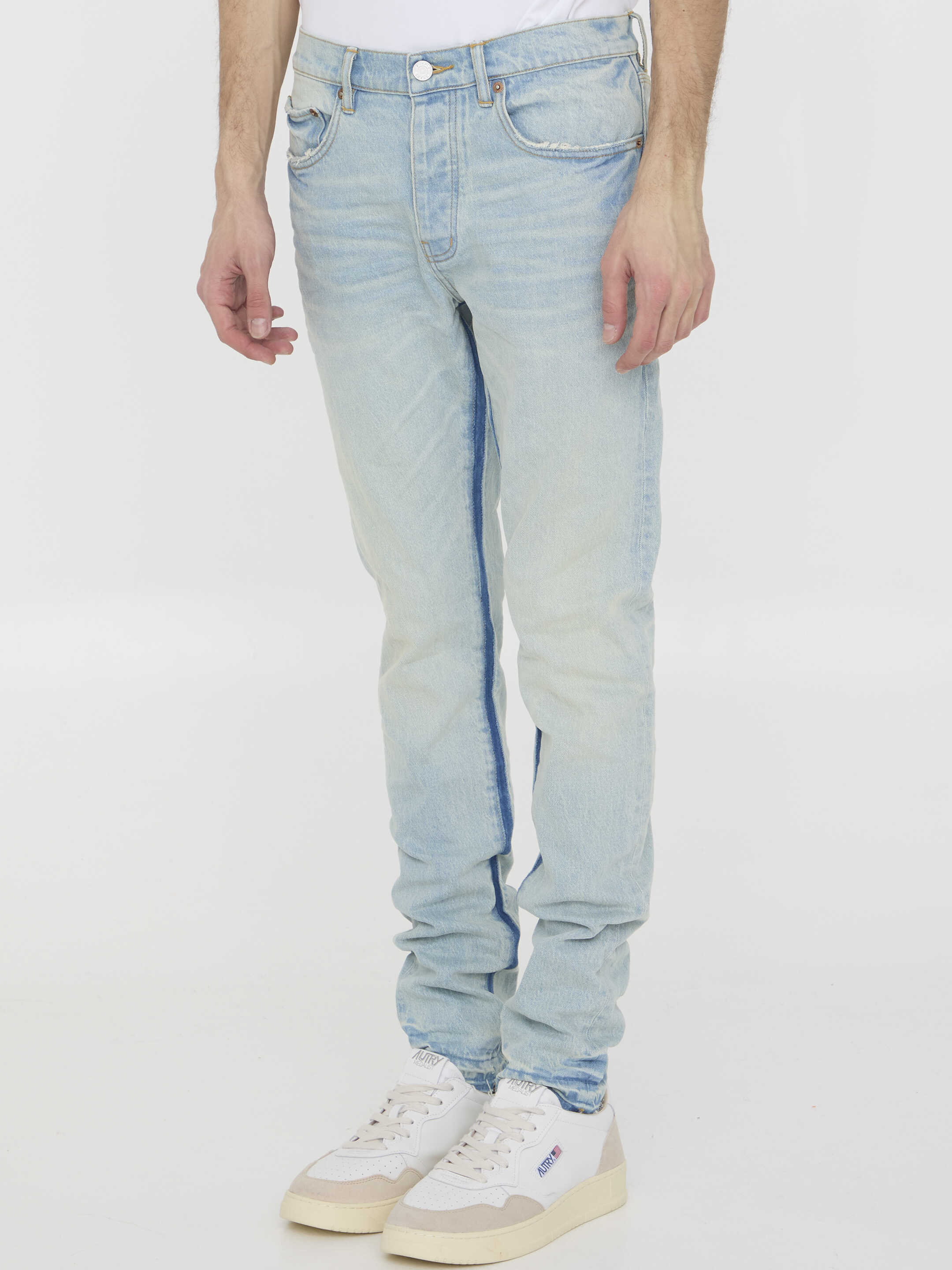 Low-rise jeans in délavé denim with distressed details and frayed details on hem. It features button closure, five-pocket design and belt loops. Leather Purple Brand label at the back. Slim fit.