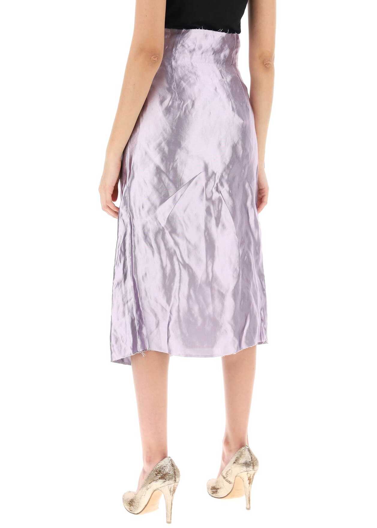 Maison Margiela wrap skirt made of metallic duchesse satin with a crinkled finish. The high-waisted straight cut is embellished with draped detailing and decorative buttons. Featuring a raw edge hem, it has a pocket on the right side and a side zip closure. Iconic 'Four Stitches' detail on the back. Model is 177 cm tall and wears size IT 40.