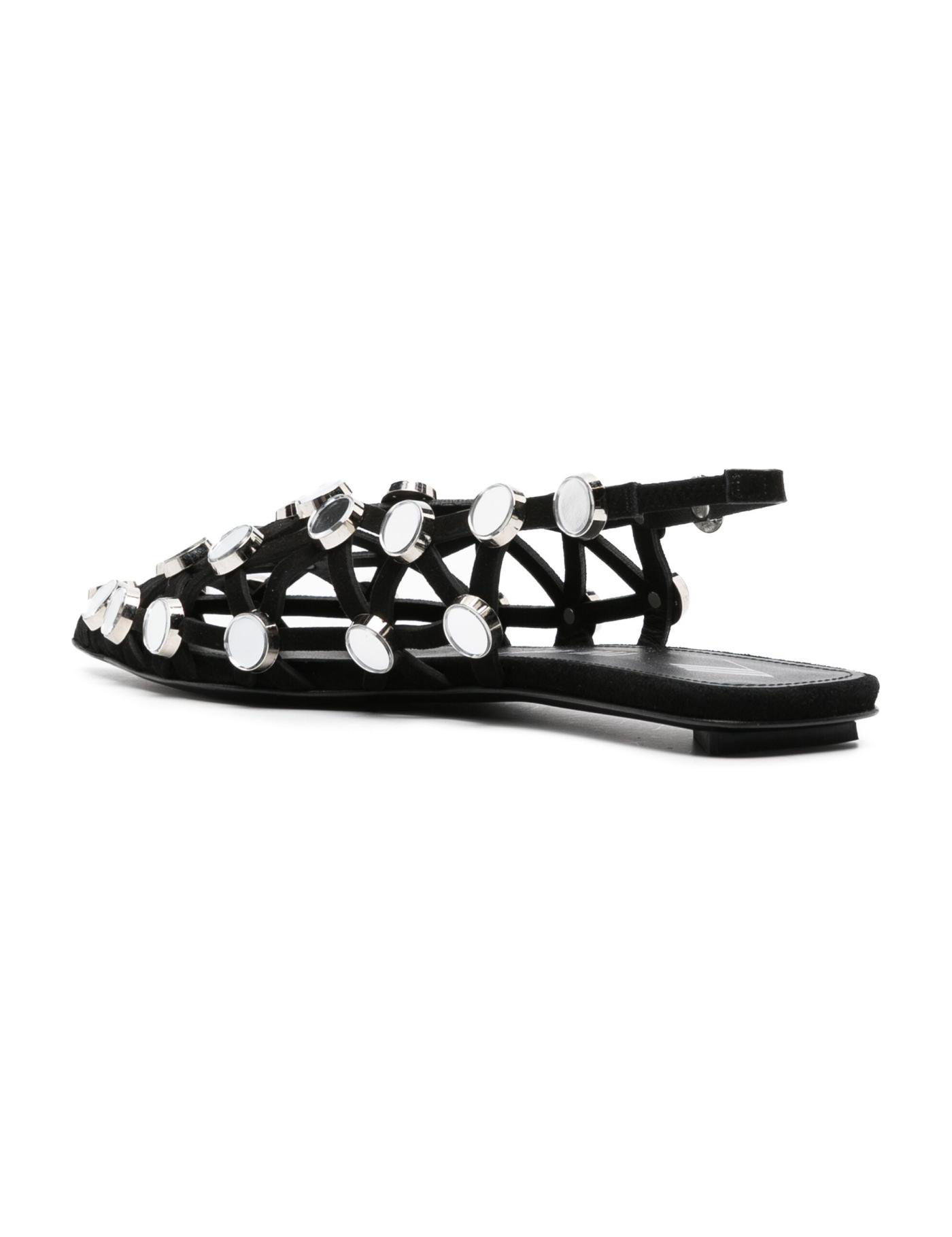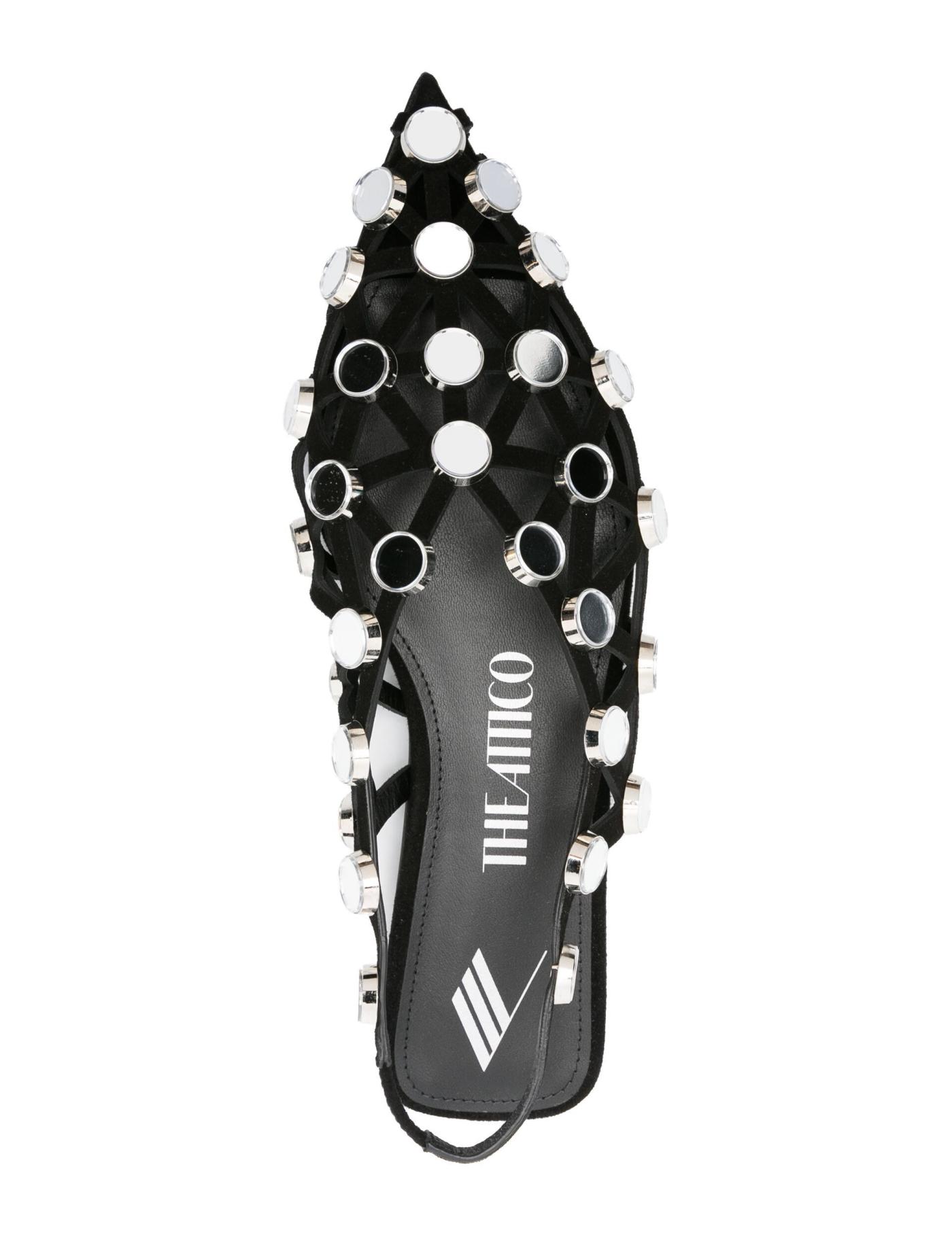 The Attico’s black slingback ballerina shoes are characterised by their sharp geometric lines. Thin leather strips are joined in a complex cut-out grid design, with mirrored rhinestones embellishing each connecting point.