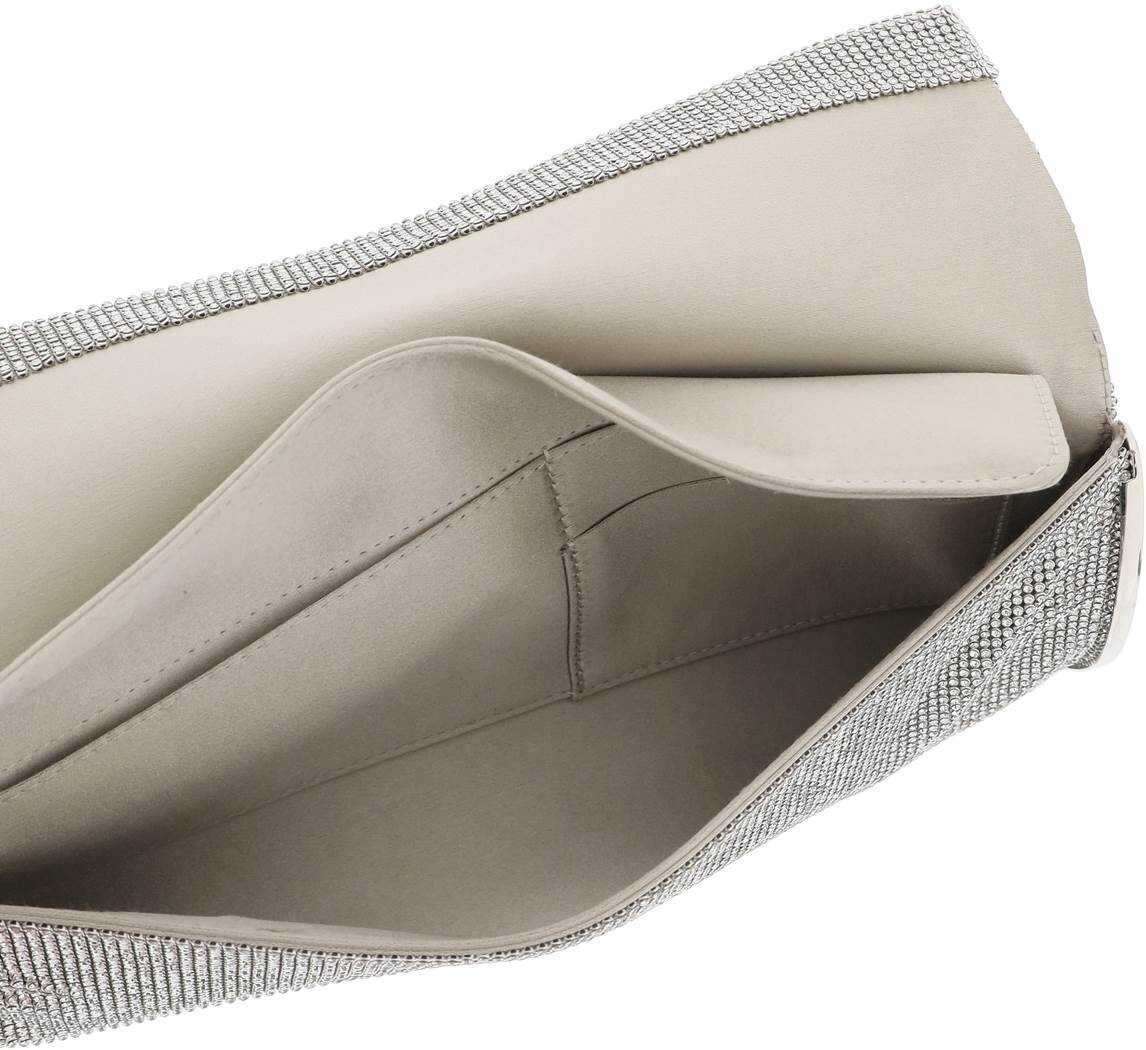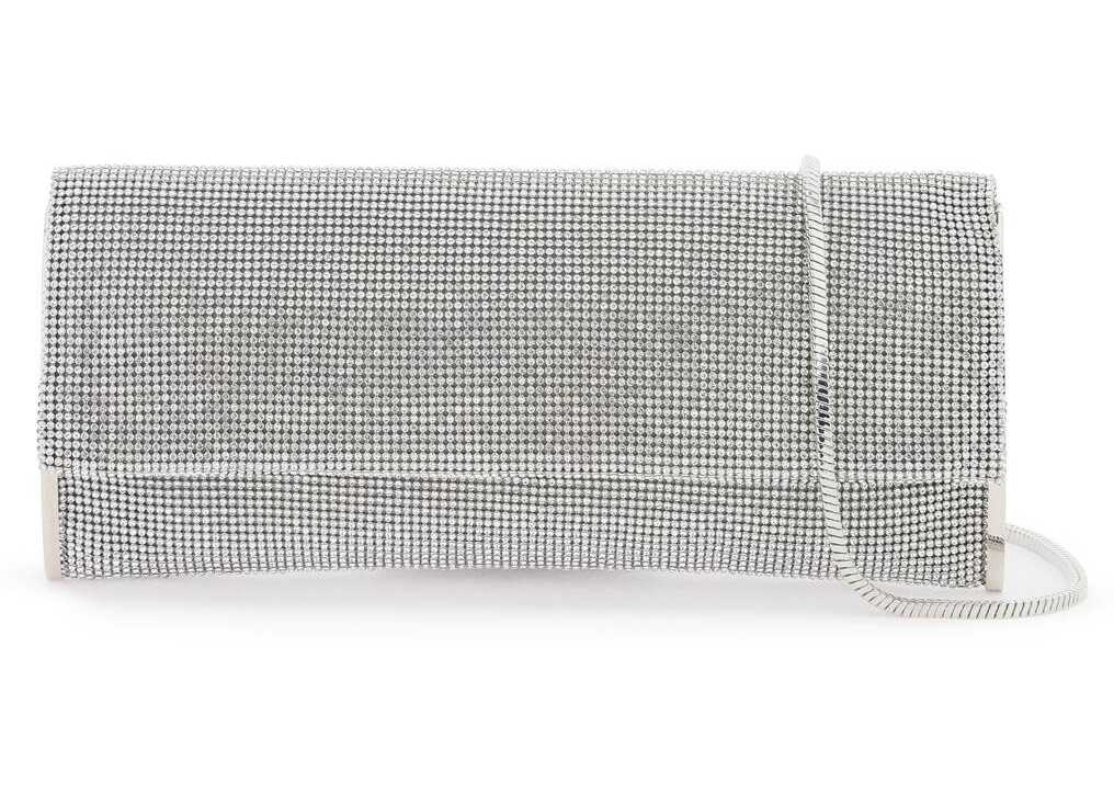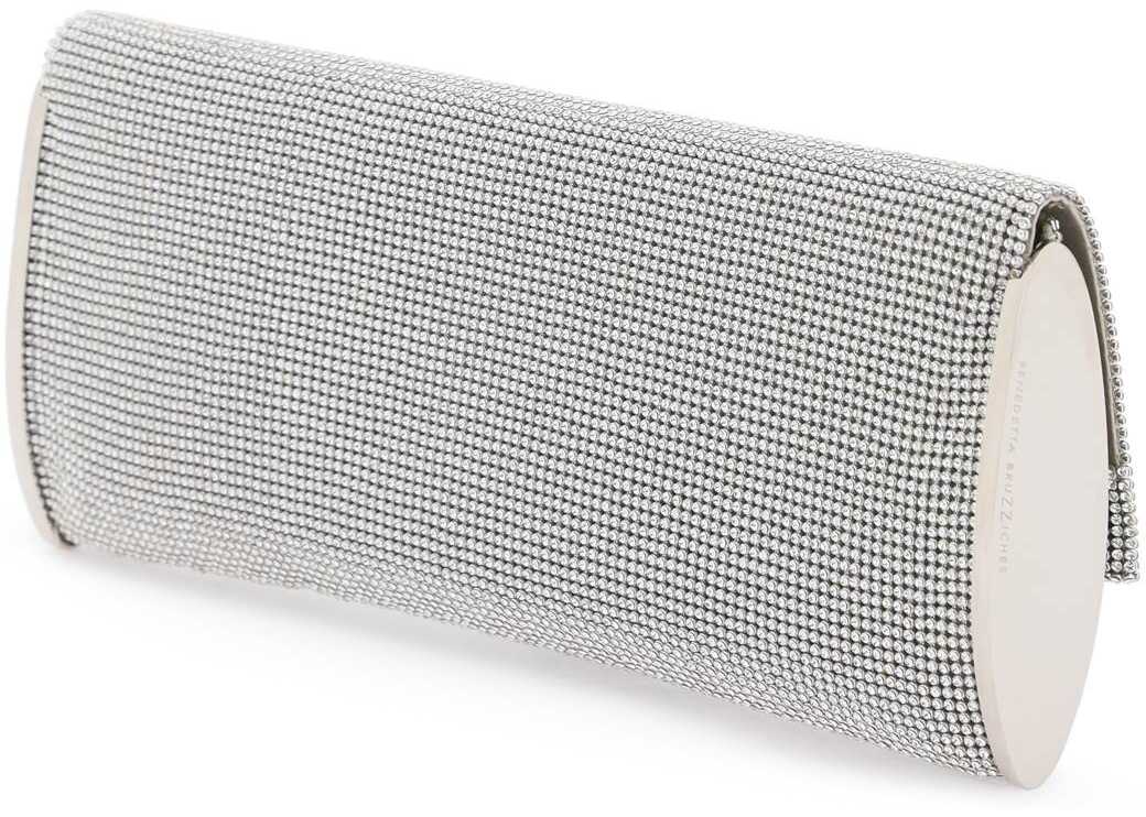 The Kate clutch by Benedetta Bruzziches is made of crystal mesh and embellished with two mirrored brass plates on the sides. It features a magnetic closure, a satin interior with three open pockets, and a removable chain strap in silver finish.