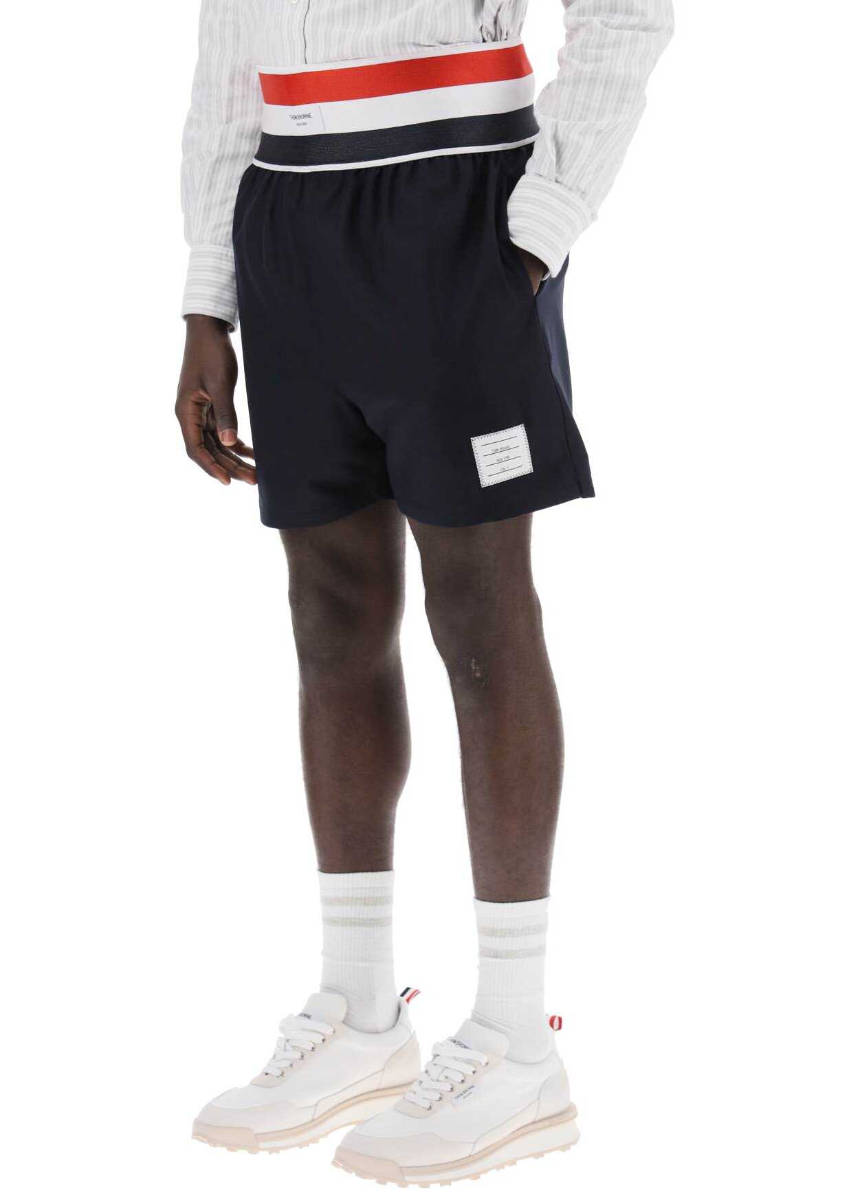 Crafted in pure wool twill and lined with mesh, these Thom Browne bermuda shorts feature an elastic waistband with a tricolor motif, embellished with a logo label. They are equipped with side seam pockets and back welt pockets with nautical-style buttons, completed by the Name Tag appliqué on the left leg and the iconic tricolor grosgrain tab at the back. Relaxed fit. The model is 187 cm tall and wears size 3 Thom Browne.