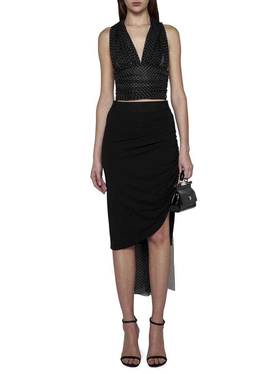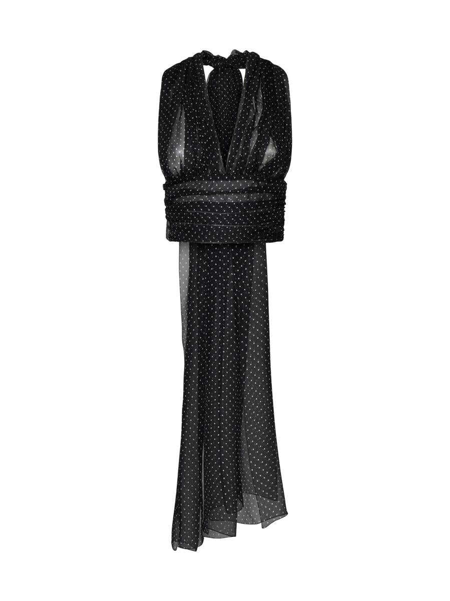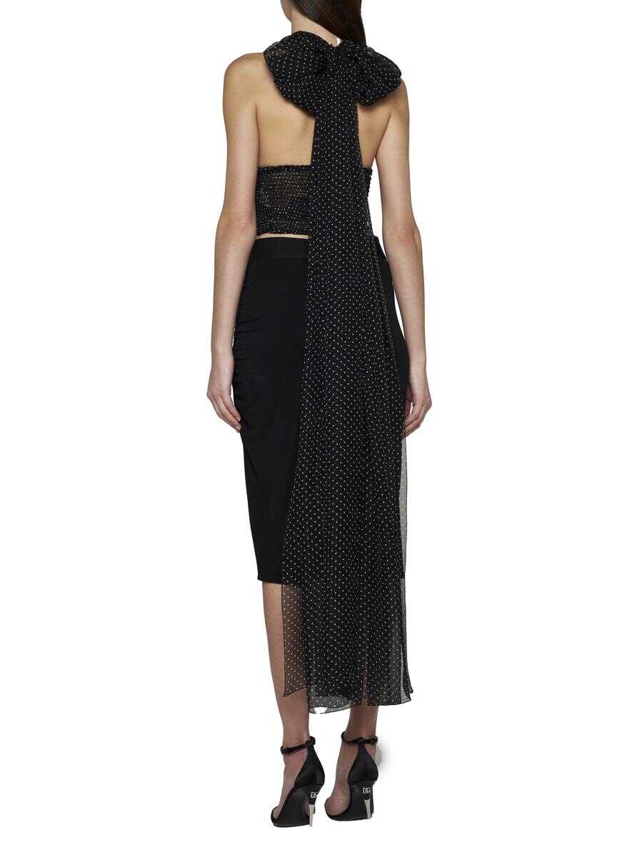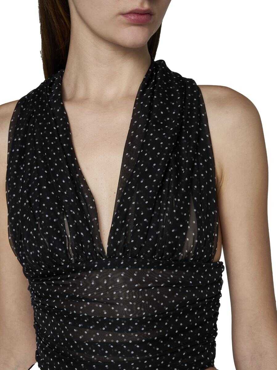 Dolce & Gabbana’s silk halter top featuring white polka dots print on a black background, long bands to tie on the back in a bow and draped and elasticated waist band with smocked back.