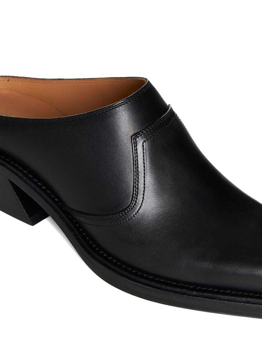 Off-White’s Cowboy black leather mules featuring a tapered and square toe, leather lining and insole and leather sole with slanted block heel.