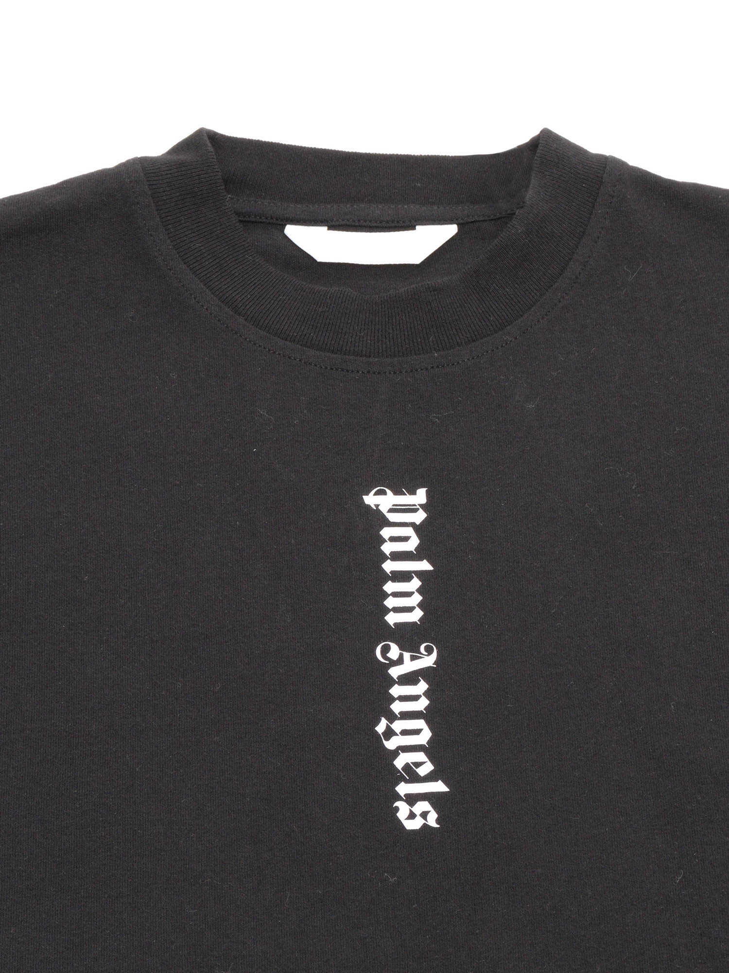 Palm Angels black t-shirt dress for girls with short sleeves, contrasting white logo on the front and back, made of cotton.