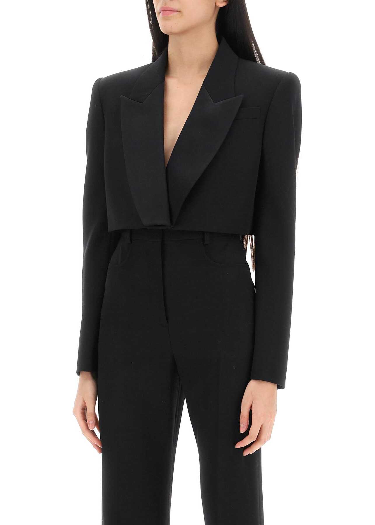 Tuxedo-inspired jacket by Alexander McQueen crafted in pure wool grain de poudre with regular cropped cut enhanced by padded shoulders. It features peak lapel with duchesse insert, a welt pocket on the chest, single-button closure and buttoned cuffs. Lined in cupro. The model is 177 cm tall and wears size IT 40.
