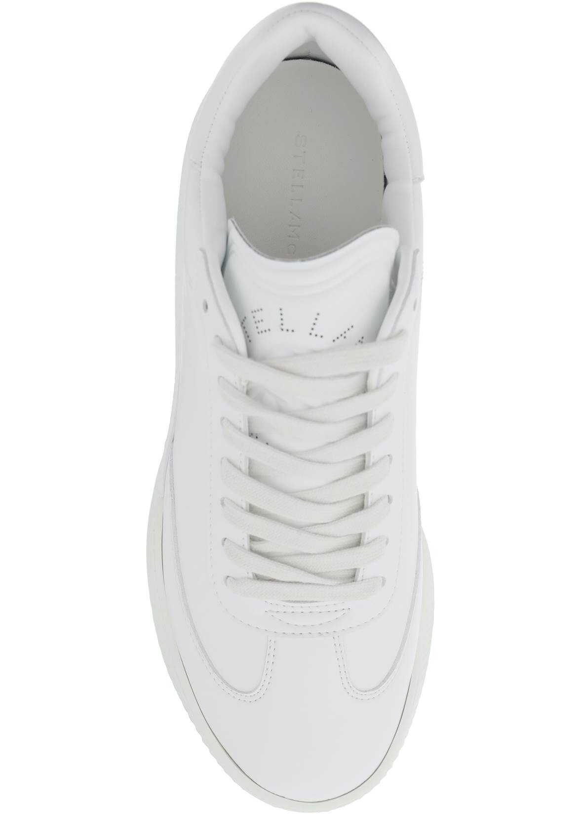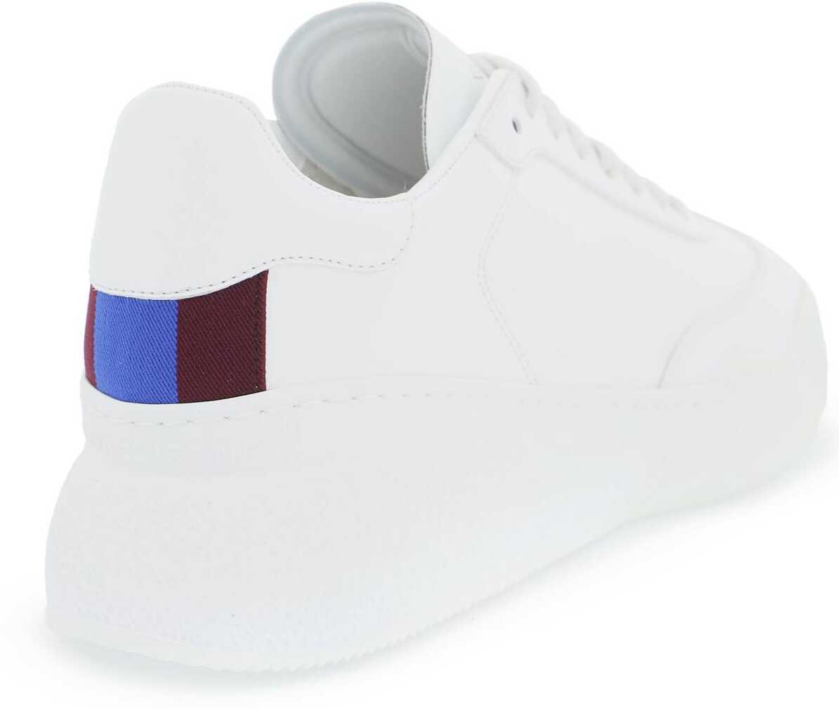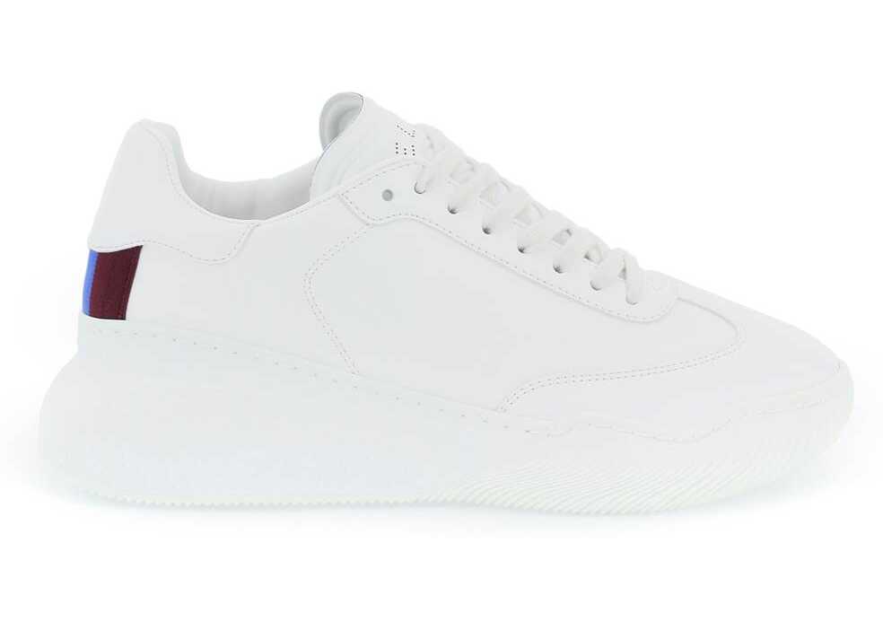 Stella McCartney faux leather sneakers with contrasting logo printed on the tongue. Contrasting two-tone striped fabric insert on the back, terrycloth lining, removable faux leather insole, rubber sole with rear embossed logo. Extra laces included.
