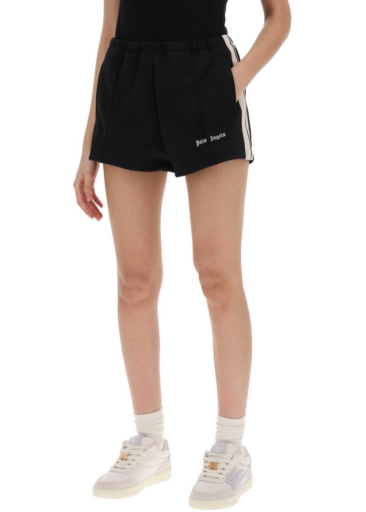 Palm Angels track shorts in solid technical jersey, finished with contrasting side bands and thigh logo embroidery. Front welt pockets and pintucks, elasticated waistband. The model is 177 cm tall and wears a size S.