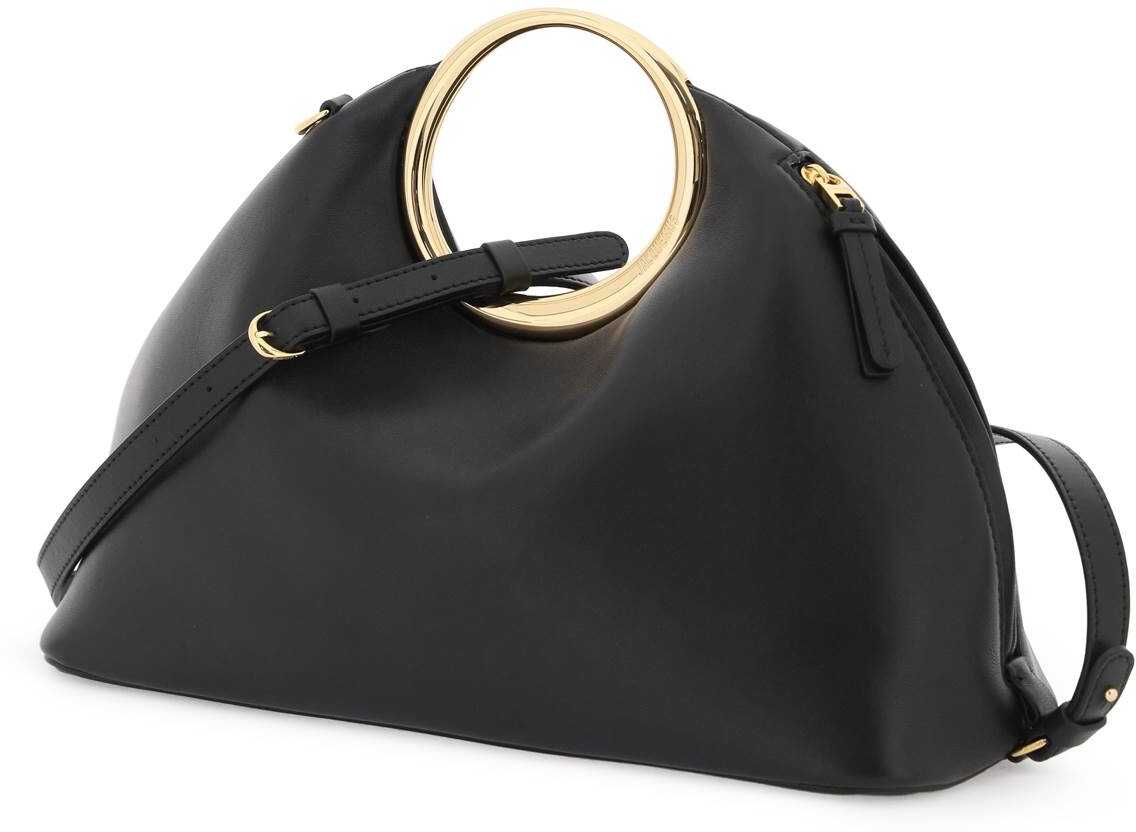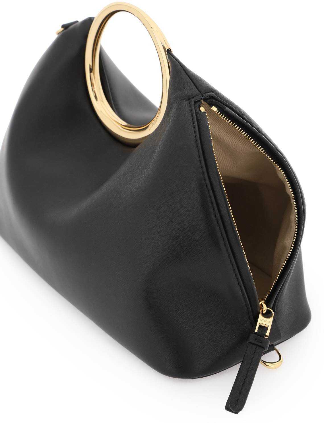 The Le Calino handbag by Jacquemus is made of soft nappa leather and features a sculptural handle in golden metal with an engraved logo, as well as a sinuous structure. It has a magnetic closure on the back and an additional side zip, with a cotton-lined interior and adjustable/removable shoulder strap.