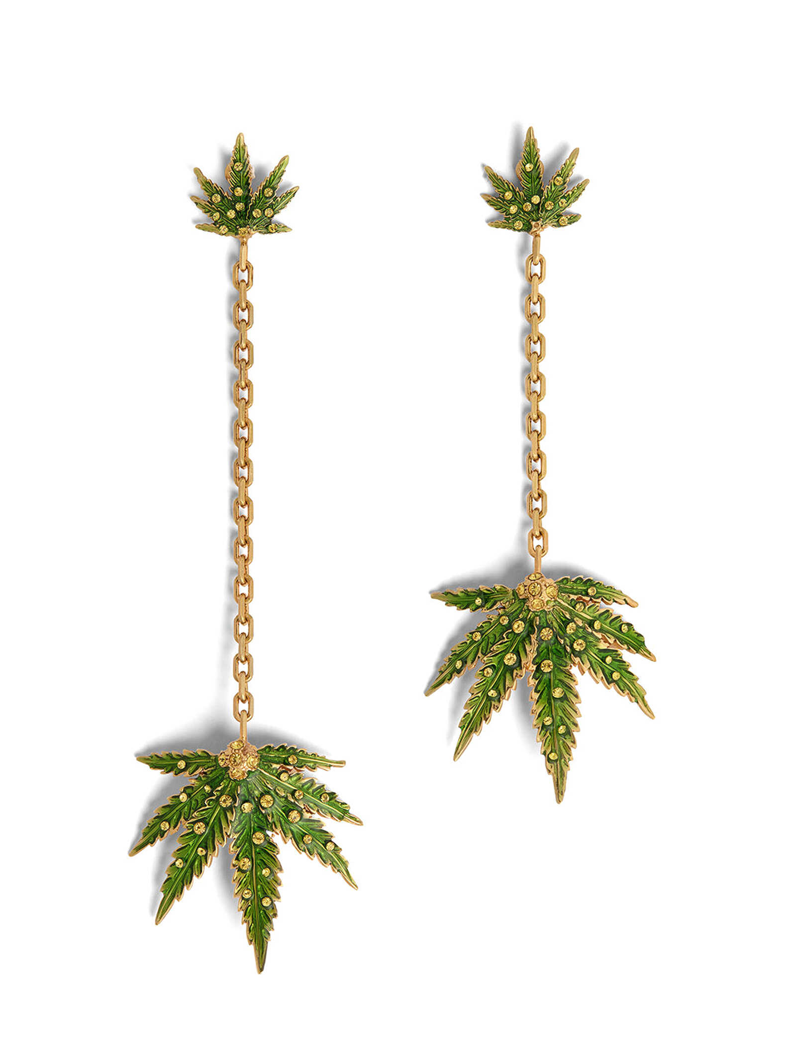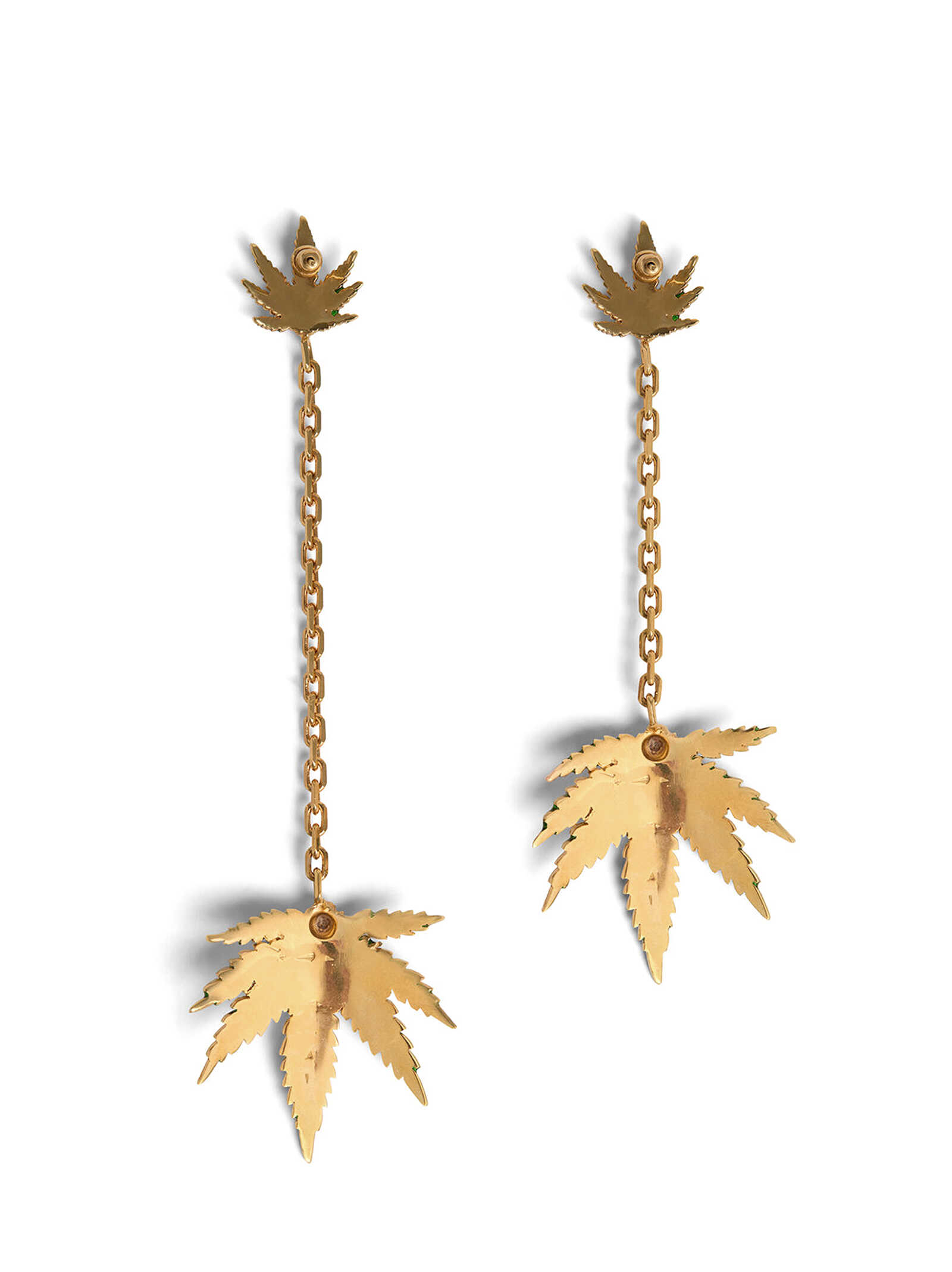 Asymmetric light gold-toned brass earrings with leaf-shaped pendant.