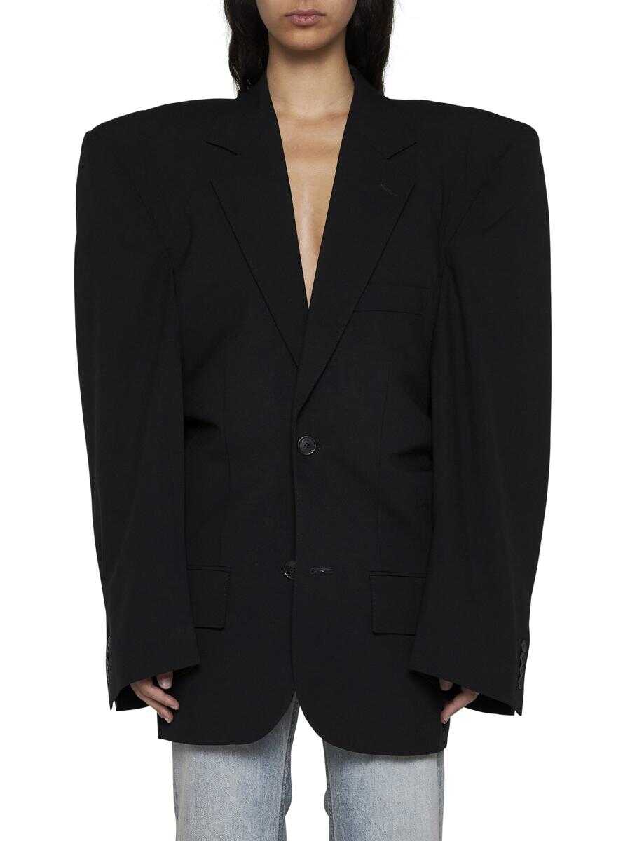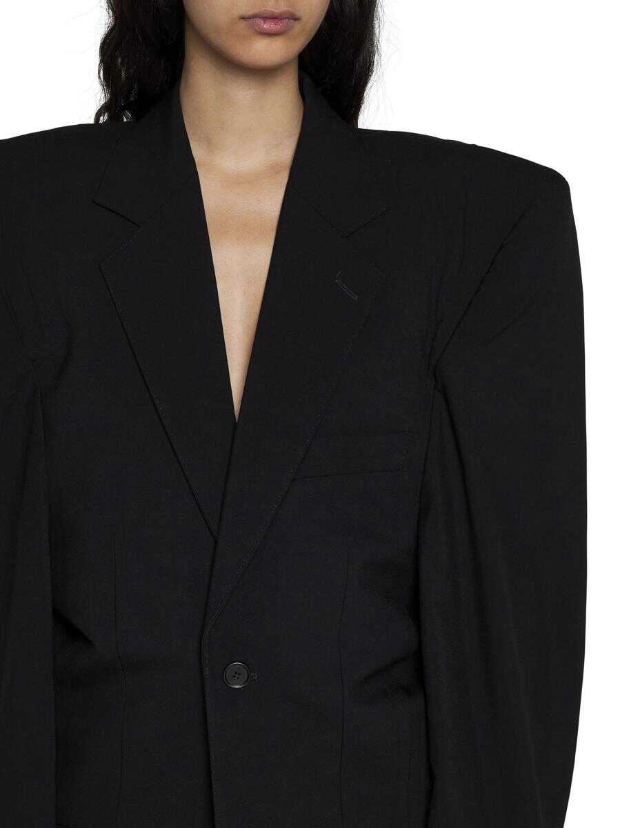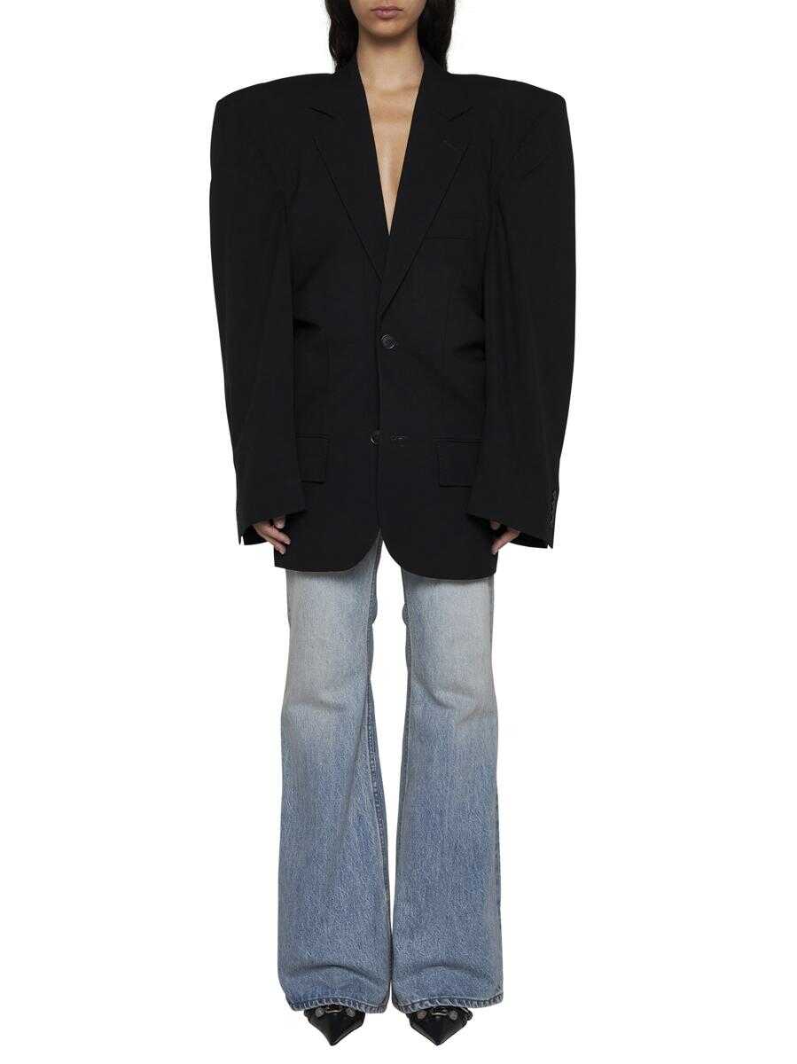 Balenciaga’s Cut Away boxy-fit blazer in black wool featuring notched lapels, oversized padded shoulders, chest pocket, low front flap pockets and back vent.