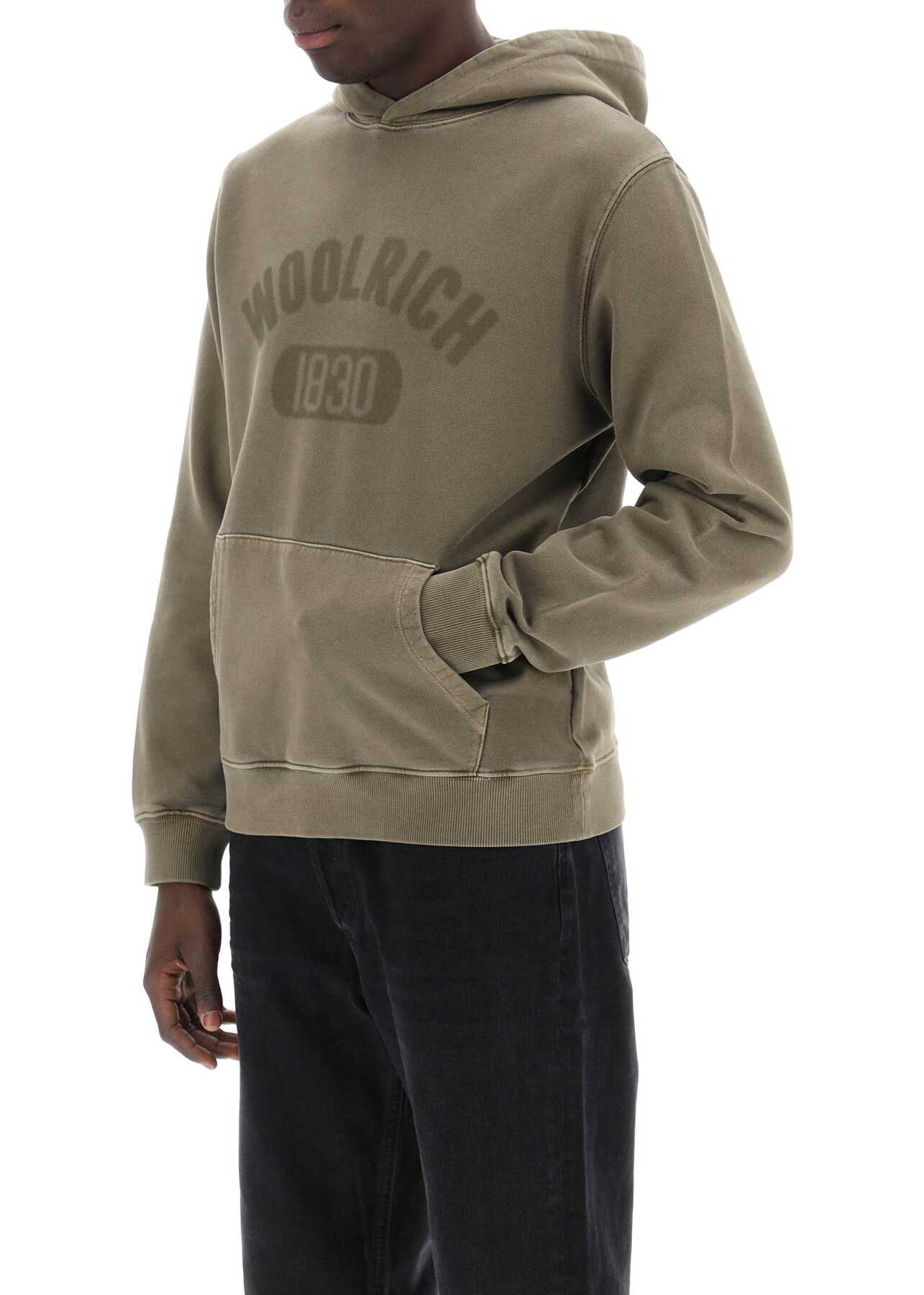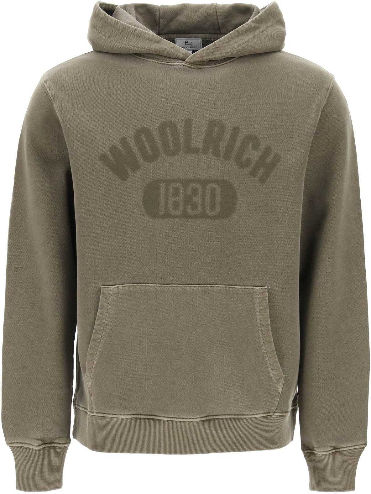 Made from French terry cotton, this Woolrich hoodie is garment-dyed for a vintage look, highlighted by the faded logo print on the front. It features ribbed cuffs and hem and a kangaroo pocket. Regular fit. The model is 187 cm tall and wears size L.