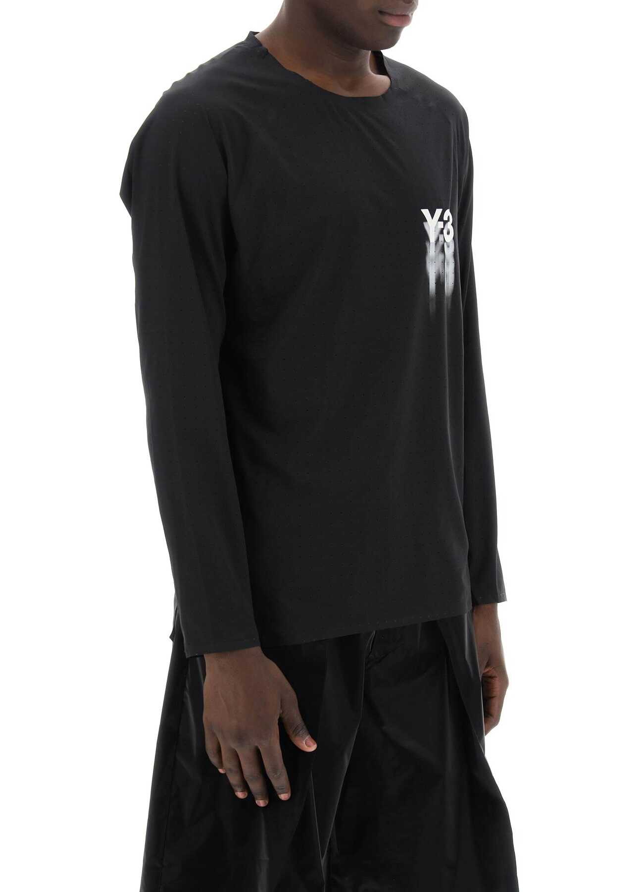 Crafted from lightweight recycled polyester technical jersey, this long-sleeved T-shirt features a faded print of the Y-3 logo on the chest and Yohji Yamamoto's signature on the back. The design is characterized by raglan shoulders, side slits at the bottom, and laser-cut edges. Regular fit. The model is 187 cm tall and wears size M.