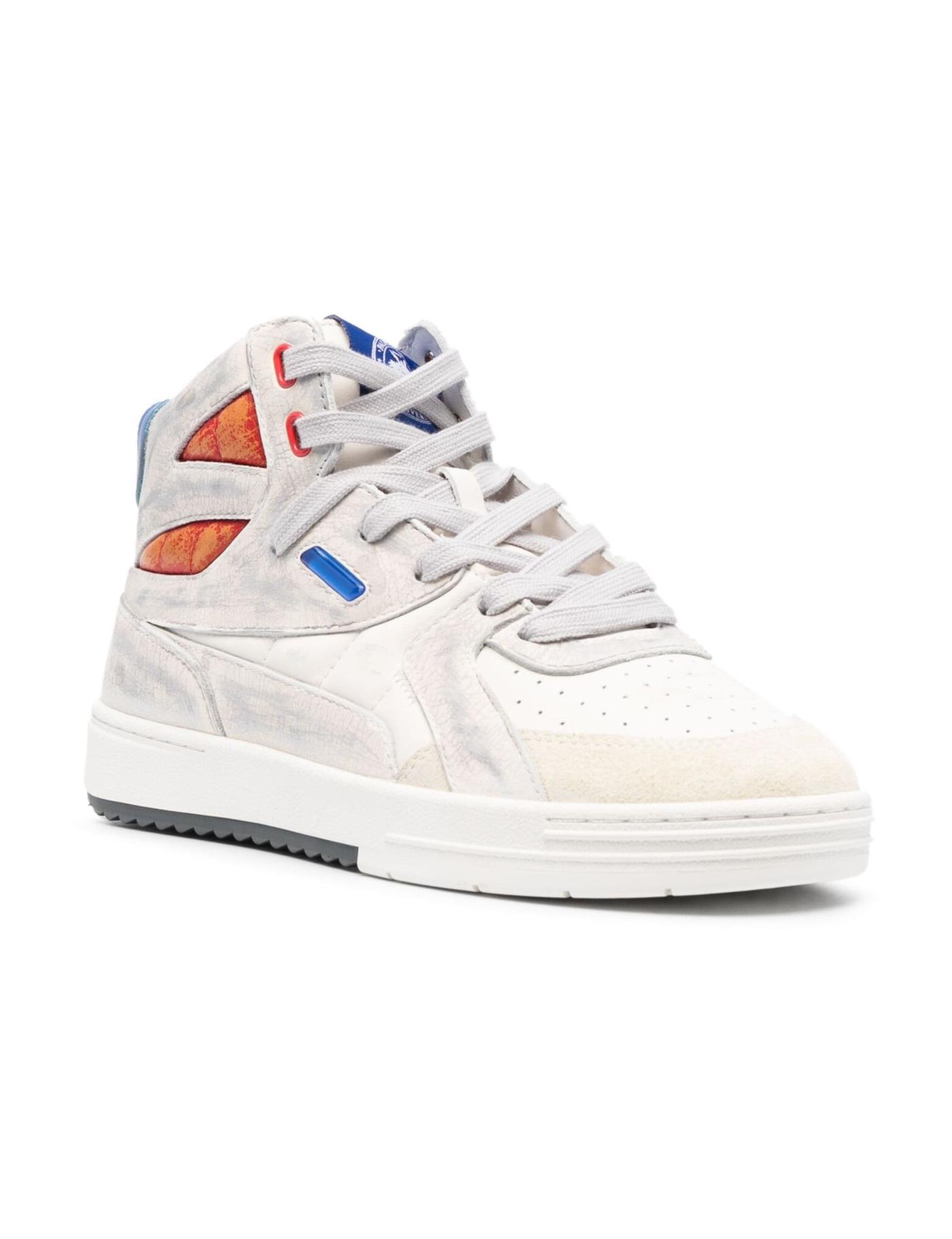 Crafted in white leather with a classic mid-top silhouette, these Vintage University sneakers boast a well-loved aesthetic and are accented with a contrasting heel counter printed with the brand's signature palm tree logo. Palm Angel's lettering is printed on the rear and ties in with the label's penchant for logomania.