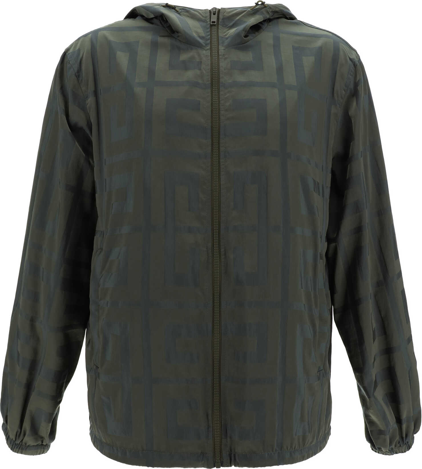 Windbreaker Jacket by Givenchy, high-collar, hooded design, drawstring-adjustable hood, two-slider front zipper closure, two side welt pockets, elasticized cuffs, adjustable hemline via concealed drawstring, all-over contrasting iconic brand logo pattern, regular fit.