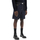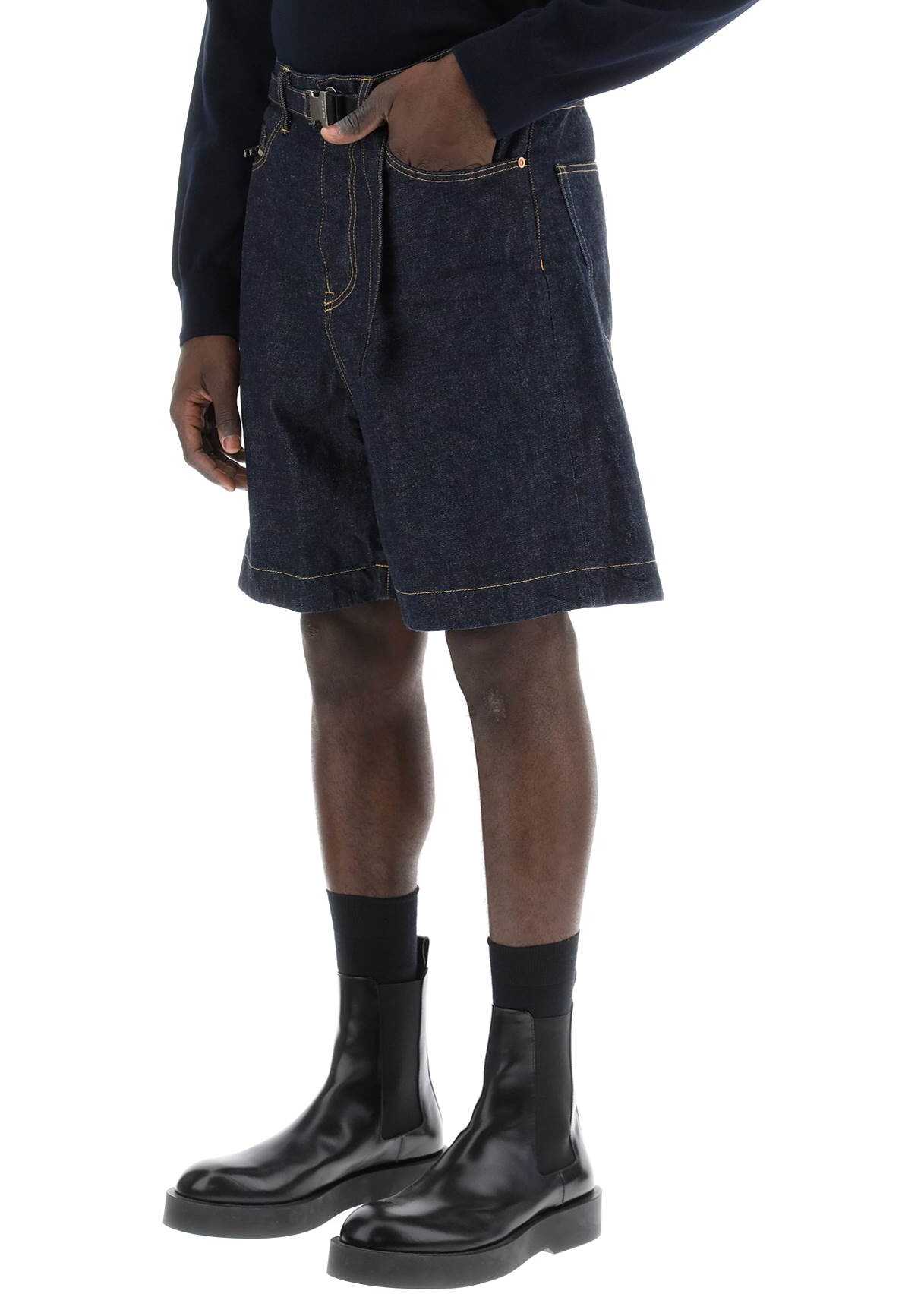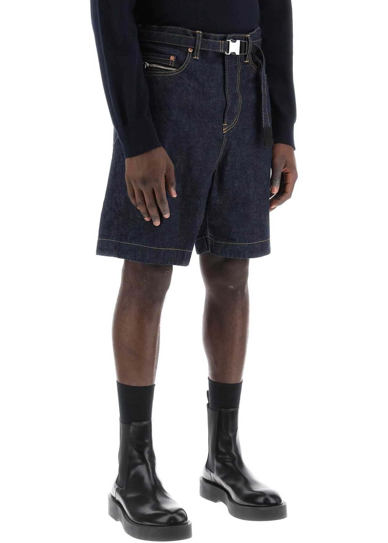 These Sacai five-pocket Bermuda shorts are made of pure cotton denim in a dark wash. They feature a wide leg cut and an adjustable, removable belt with an engraved buckle. The hidden zip and button closure, contrast stitching, and fifth pocket with zipper add to the overall design. The model is 187 cm tall and wears size 3.