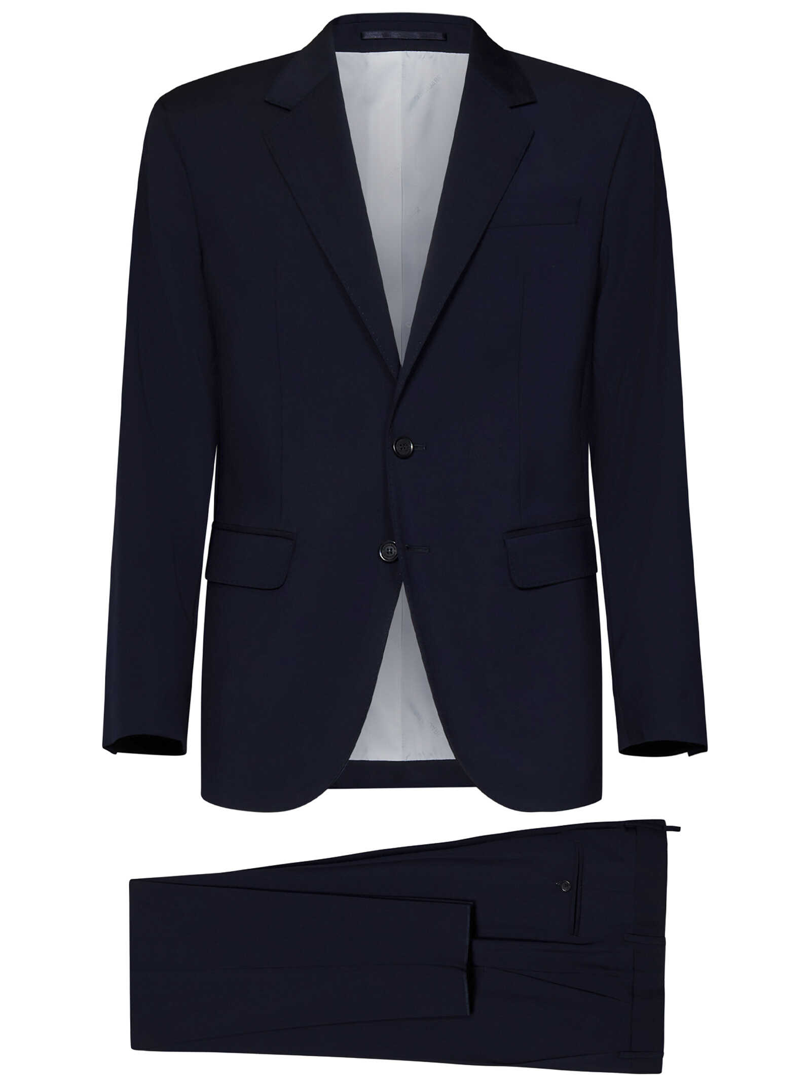 Navy virgin wool regular-fit suit with single-breasted blazer and one-pleat trousers.