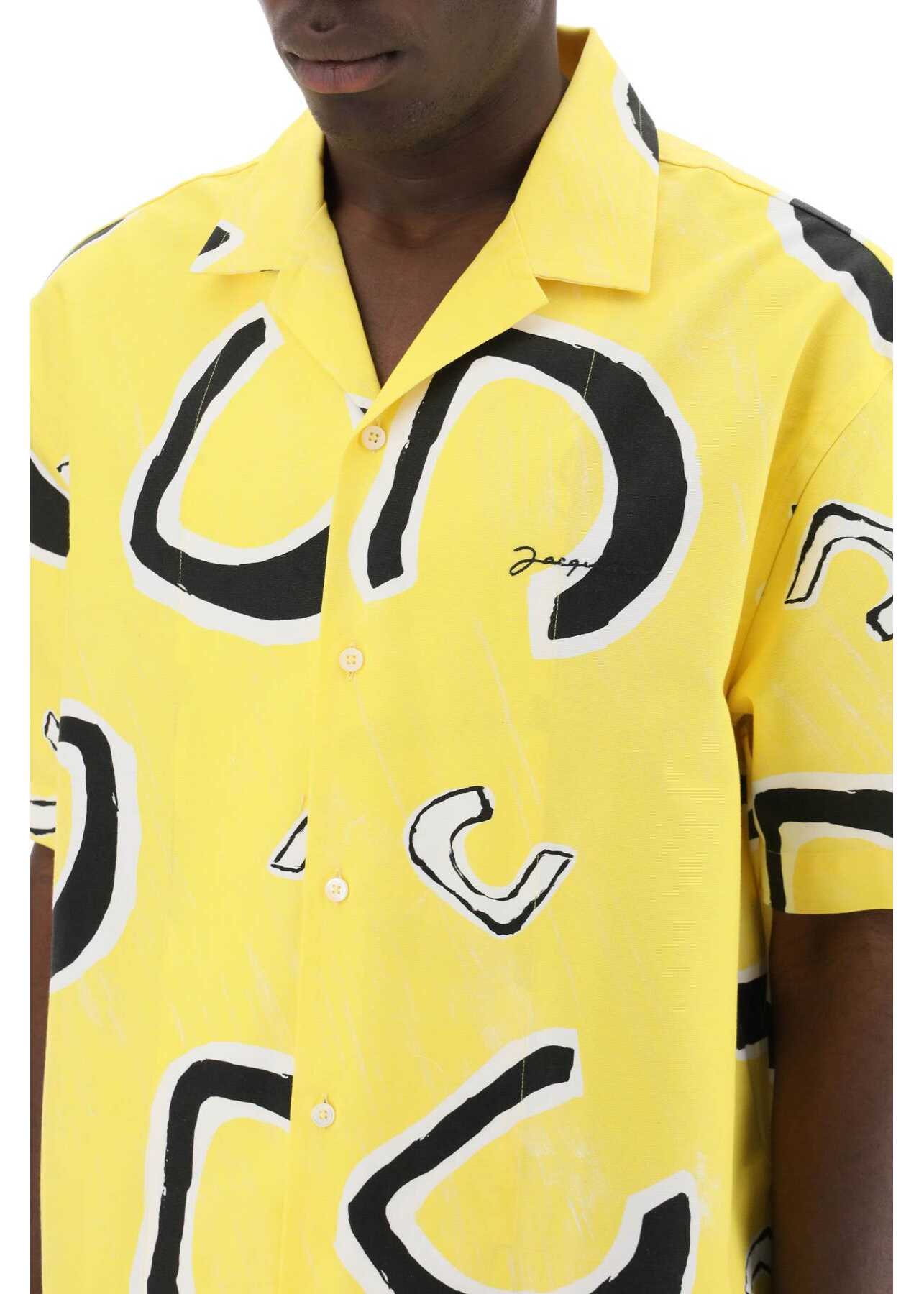 This Jacquemus Jean shirt is made of cotton fabric and decorated with an all-over monogram print. It features a bowling collar, front button closure, back yoke with loop, and a loose fit. The model is 187 cm tall and wears size IT 52.
