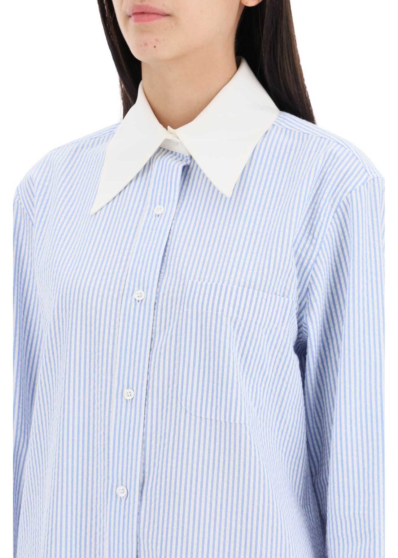 Thom Browne's maxi chemisier dress is made of striped seersucker cotton, enriched by a pointed collar and high silk faille cuffs in contrast. It features a front button closure with a placket, a patch pocket on the chest, and an asymmetrical rounded hem with side slits. Signed with a Name Tag at the bottom and a tricolor tab behind the neck. Straight design and regular fit. The model is 177 cm tall and wears size IT 40.