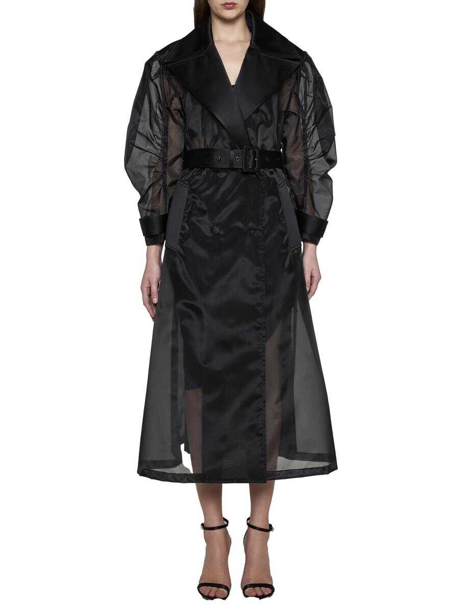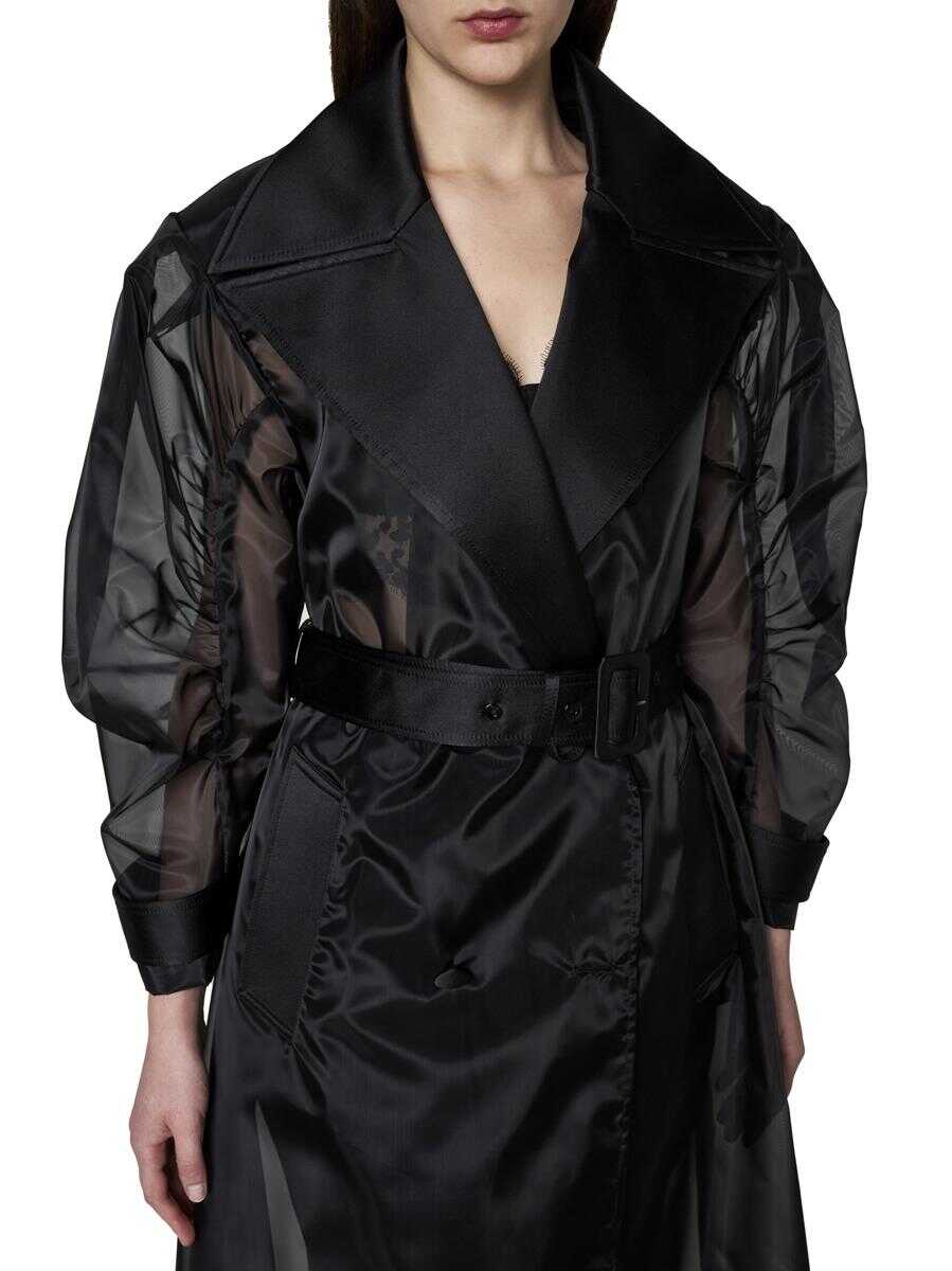 Dolce & Gabbana’s trench coat in black satin and transparent fabric featuring wide notched lapels, waist belt with rectangular buckle, dropped shoulders, wide puffed sleeves, side pockets and vent at center back.