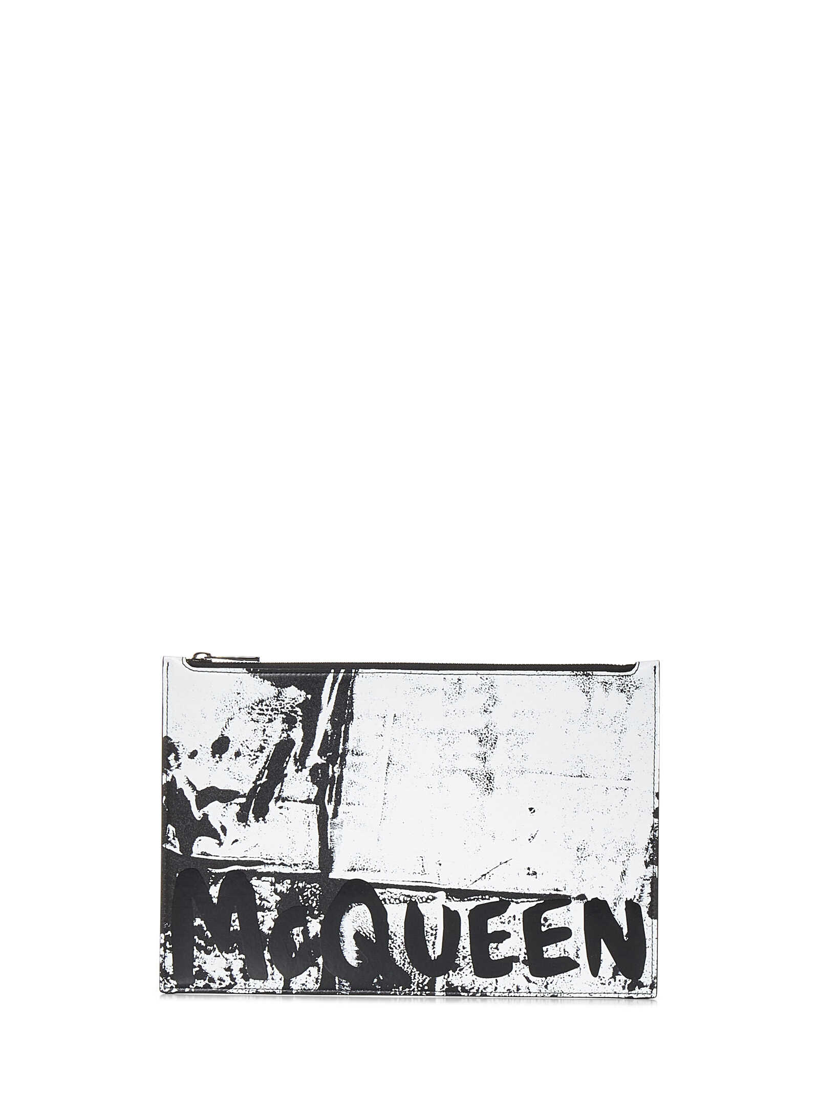 White and black Fold-print calf leather clutch with Graffiti logo at front.