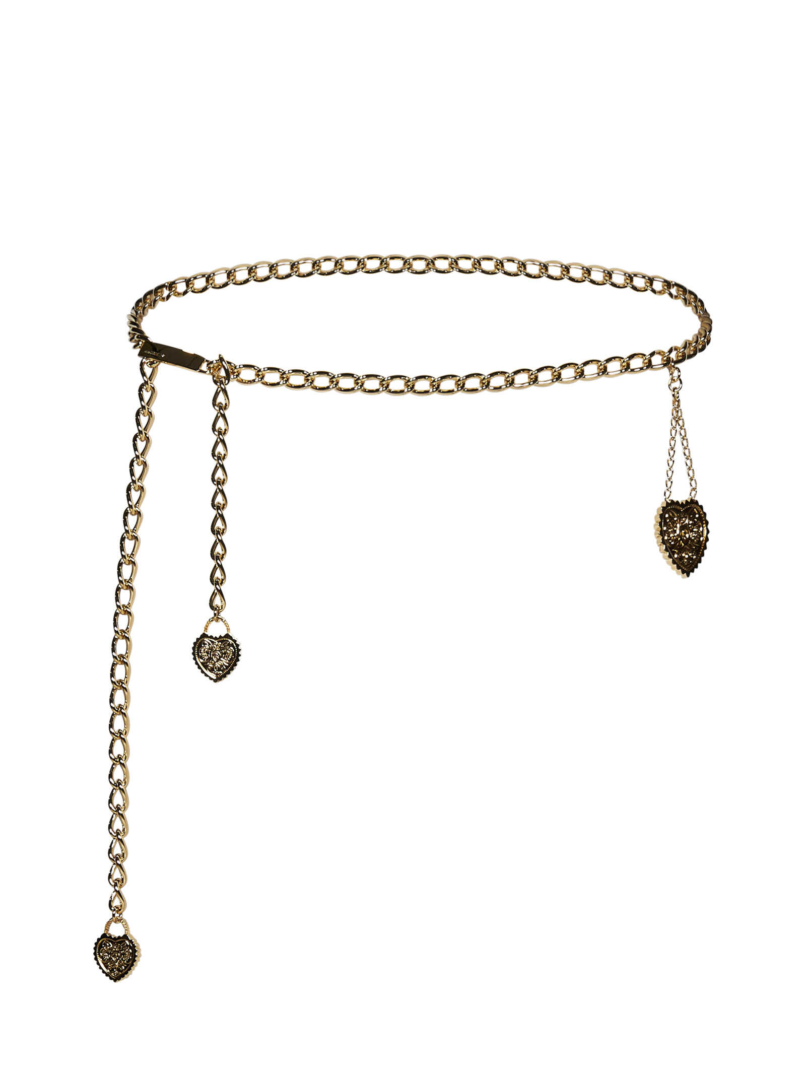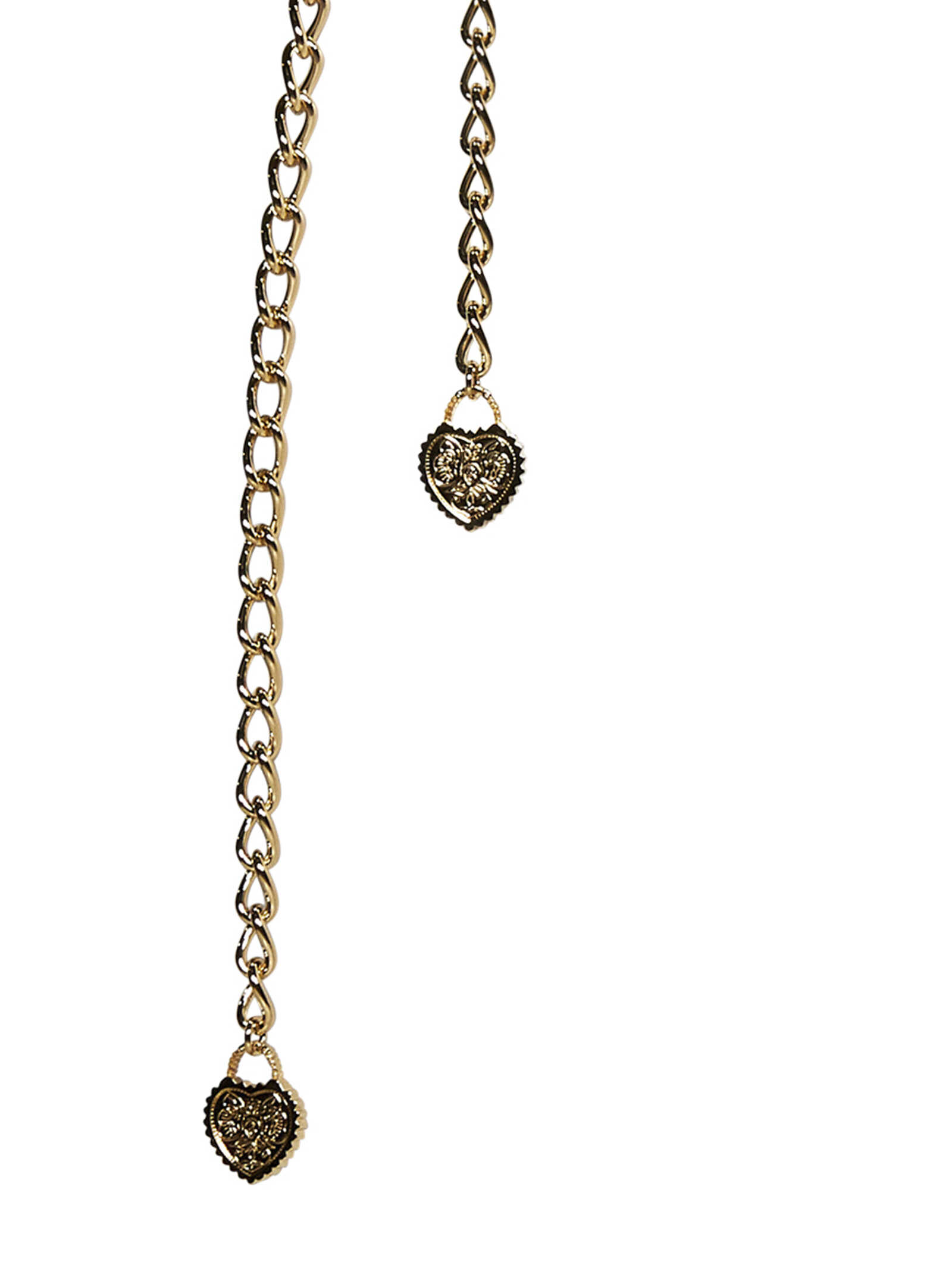 Gold metal chain belt with heart-shaped pendants.