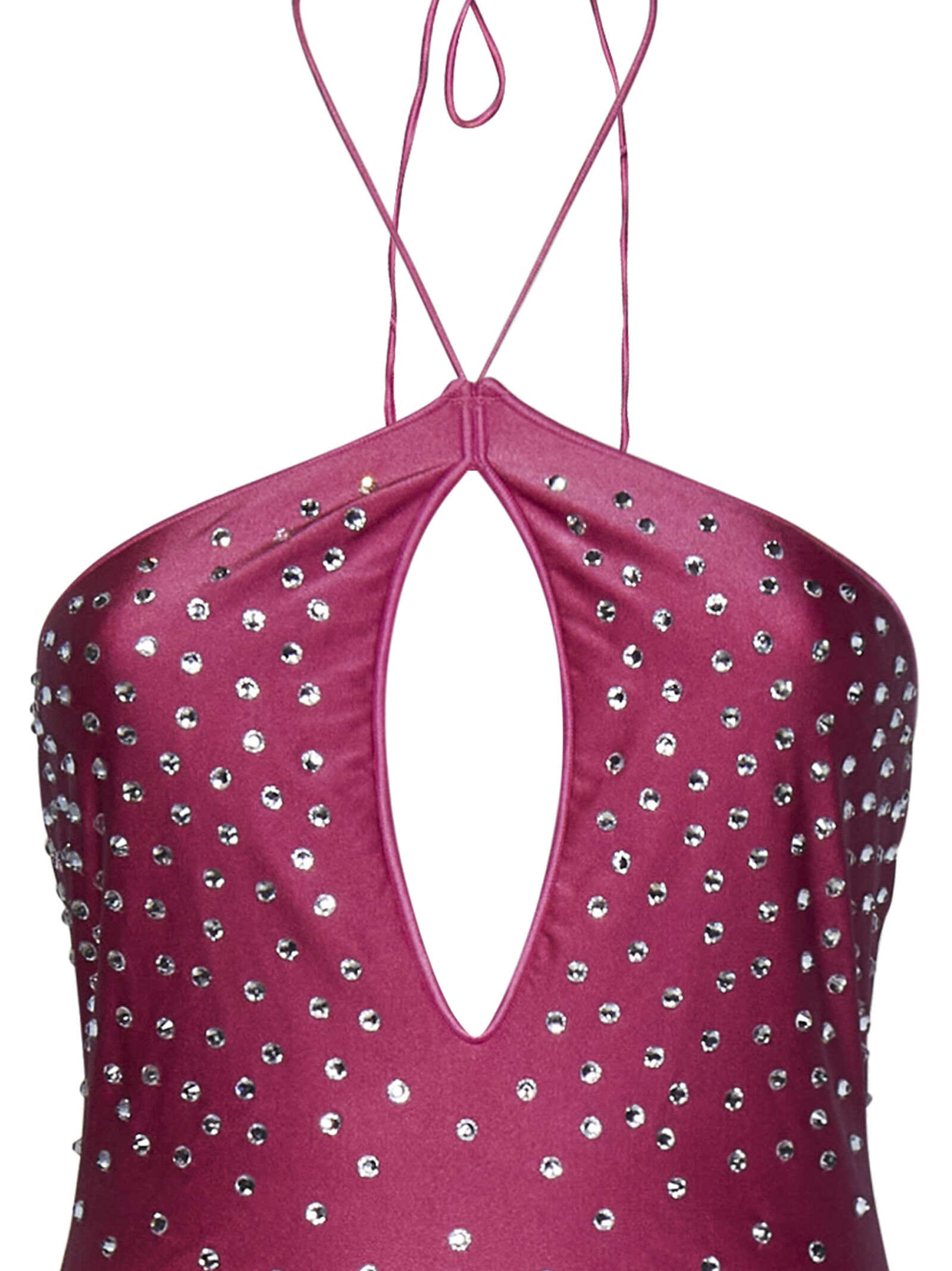 Fuchsia one-piece swimsuit with teardrop cut-out and all-over applied gems.