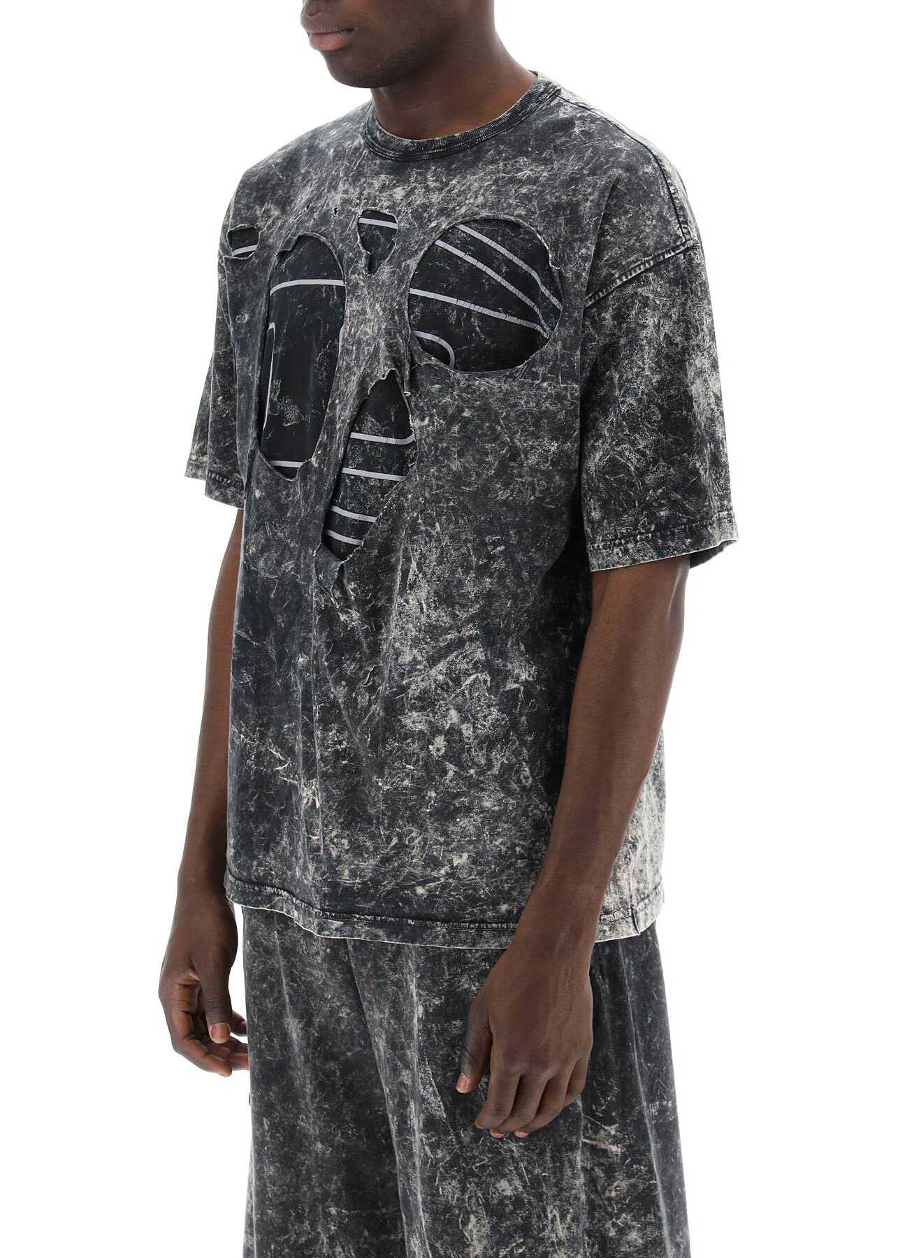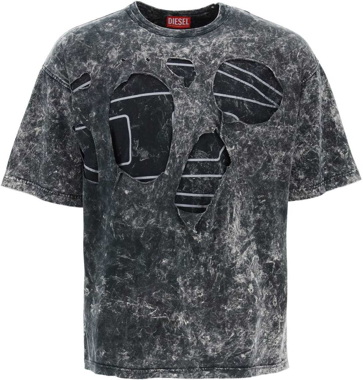This Diesel T-shirt is made of double-layered marbled cotton jersey and features destroyed details that hide the characteristic Oval D print on the chest. It has a ribbed crew neck and stands out for its oversized fit with dropped shoulders. The model is 187 cm tall and wears a size L.