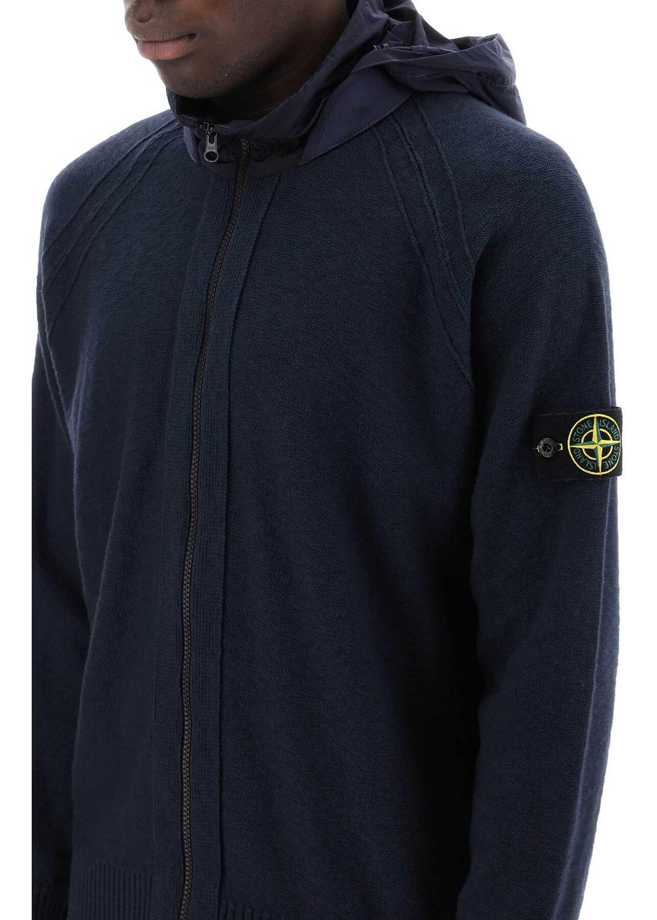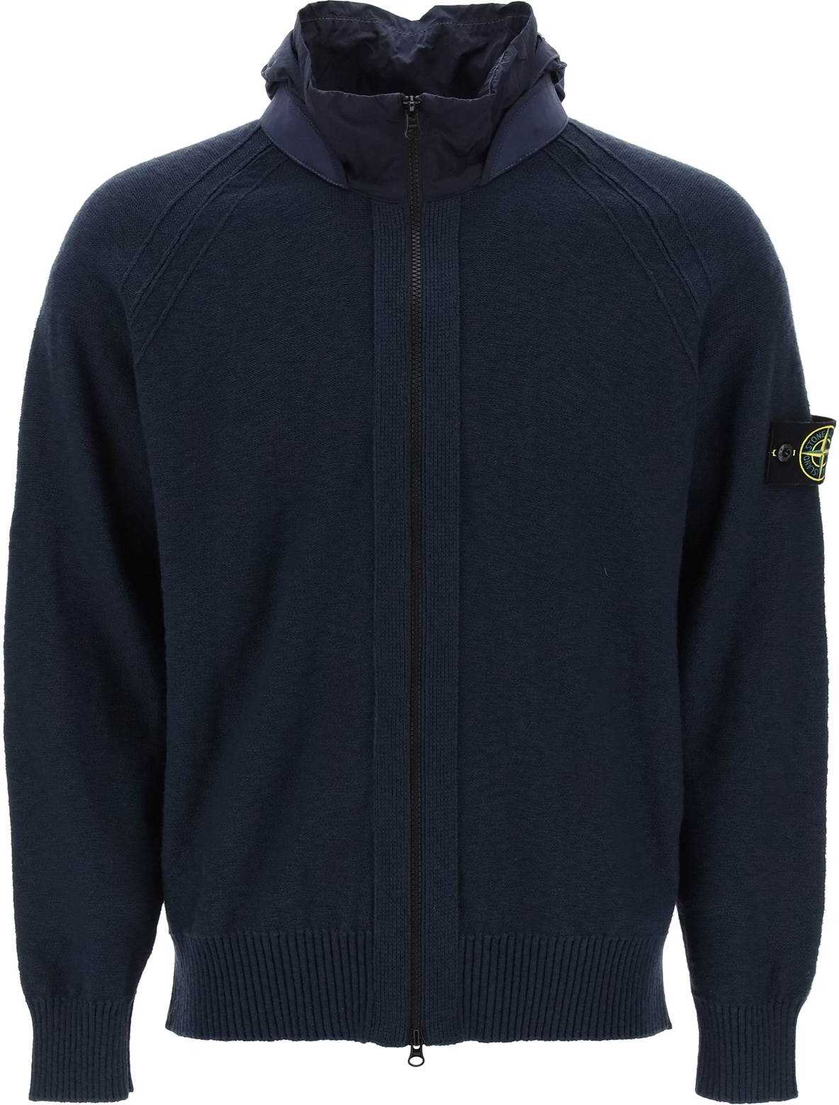 This Stone Island cardigan is made of 7-gauge cotton knit, with a high collar and detachable hood featuring a tonal Nylon Metal drawstring. It has raglan sleeves, a double-slider zip closure, and ribbed finishes. Signed with the iconic Stone Island badge on the sleeve. Relaxed fit. The model is 187 cm tall and wears a size L.