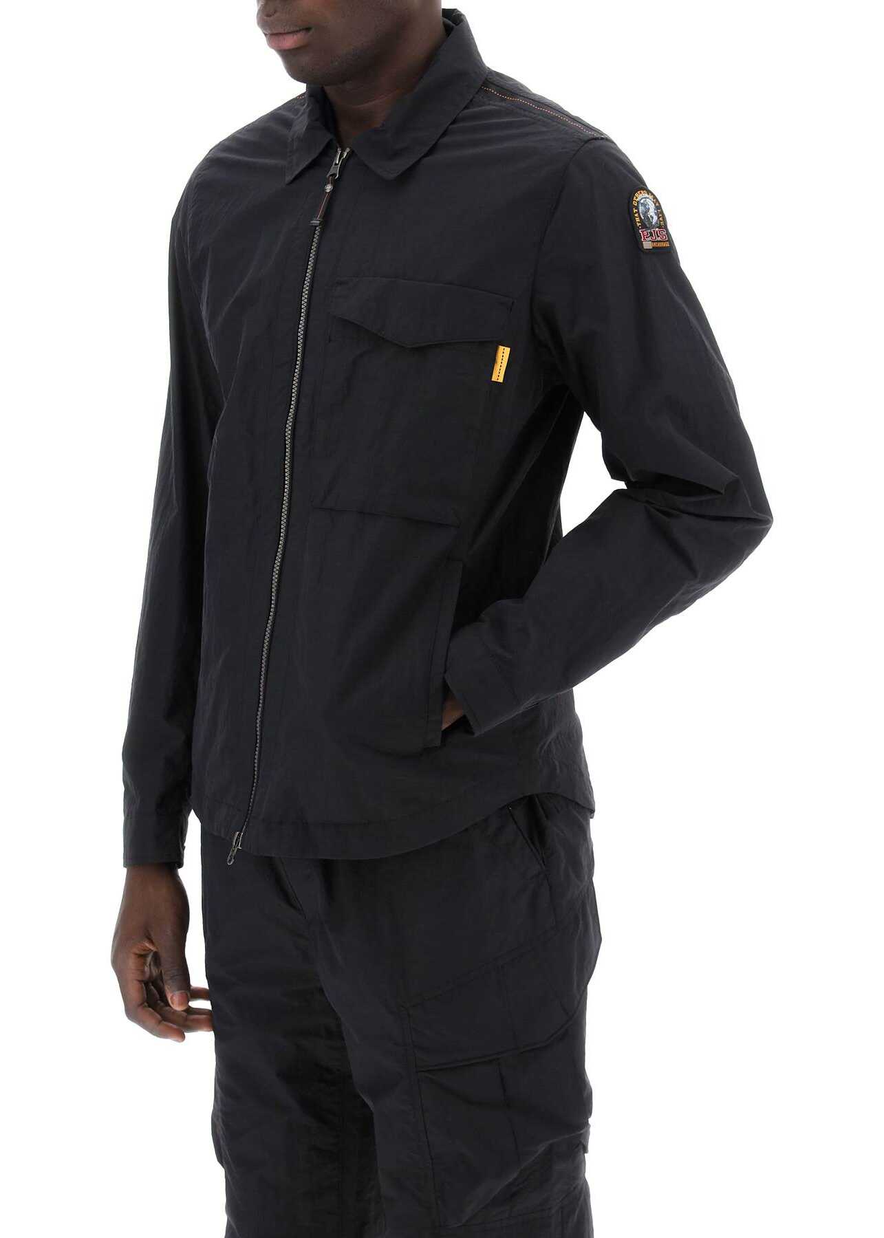 The Rayner Parajumpers Overshirt is made of water-repellent poplin in recycled nylon and BCI cotton, featuring the iconic yellow tape on the chest pocket and logo patch on the left sleeve. It has a two-way zip closure, pointed collar, side welt pockets, adjustable cuffs, contrast stitching on the shoulder insert with hidden mesh panel for breathability, and a regular fit. The model is 187 cm tall and wears size L.
