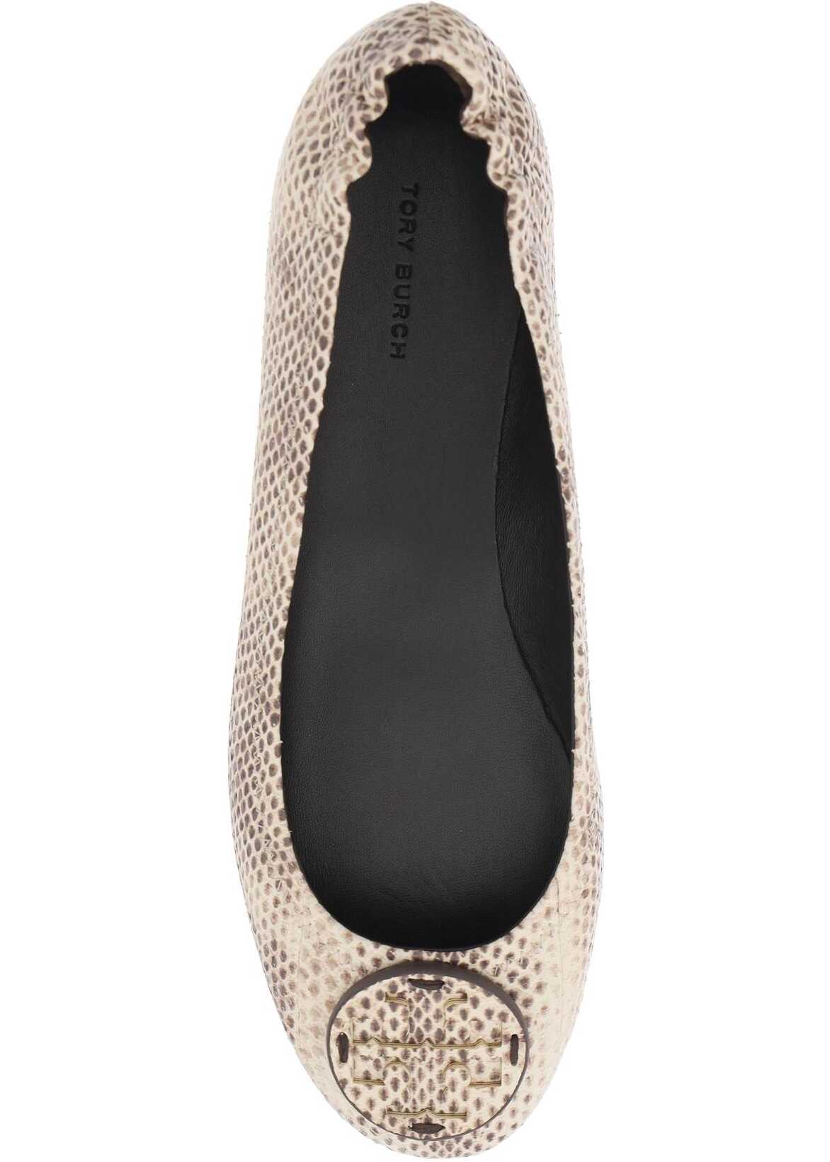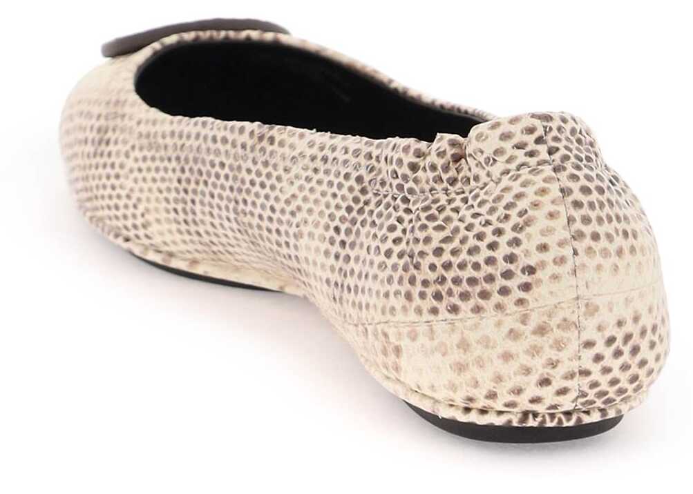 The Tory Burch Minnie Travel ballerina flats are made of python leather with a tone-on-tone Double T detail applied on the toe. The interior is lined in leather and the sole features rubber inserts for added comfort.